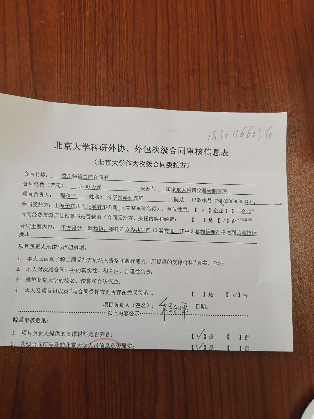根据《关于北京大学理工科科研次级合同管理的通知》,现将北京大学理工科科研次级合同委托物镜生产合同书”的相关内容予以公示。公示时间:2020年10月26日-2020年10月28日(3个工作日)。合同相关纸质材料可经预约后到勺园5乙330办公室进行查阅。