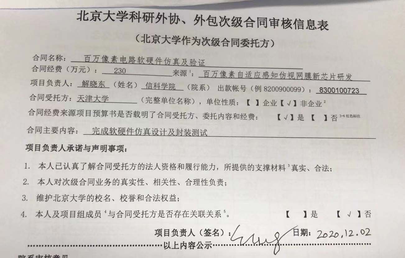 根据《关于北京大学理工科科研次级合同管理的通知》,现将北京大学理工科科研次级合同百万像素电路软硬件仿真及验证”的相关内容予以公示。公示时间:2020年12月8日-2020年12月10日(3个工作日)。合同相关纸质材料可经预约后到勺园5乙330办公室进行查阅。
