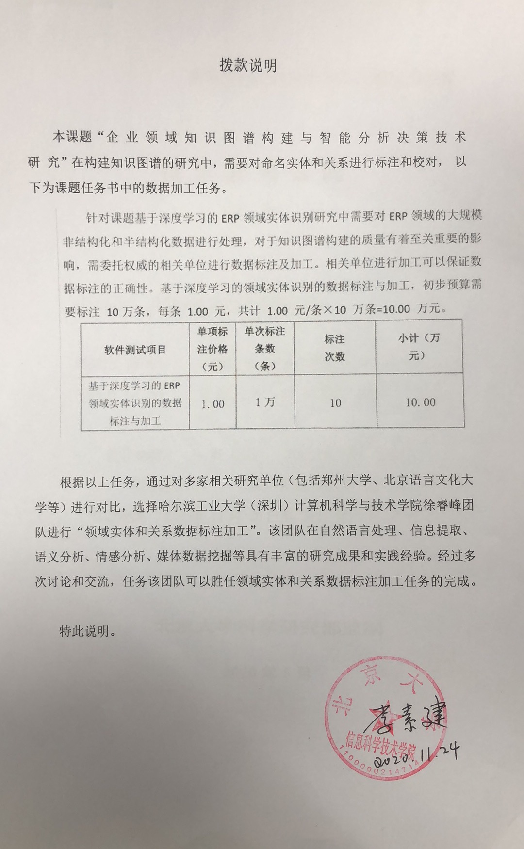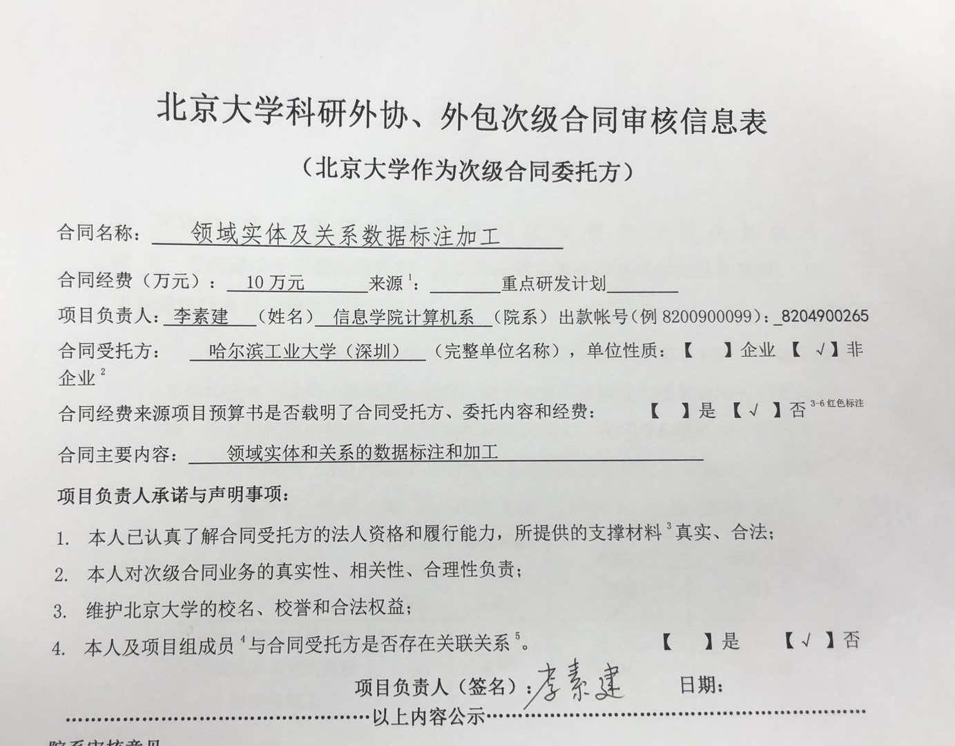 根据《关于北京大学理工科科研次级合同管理的通知》,现将北京大学理工科科研次级合同“领域实体及关系数据标注加工”相关内容予以公示。