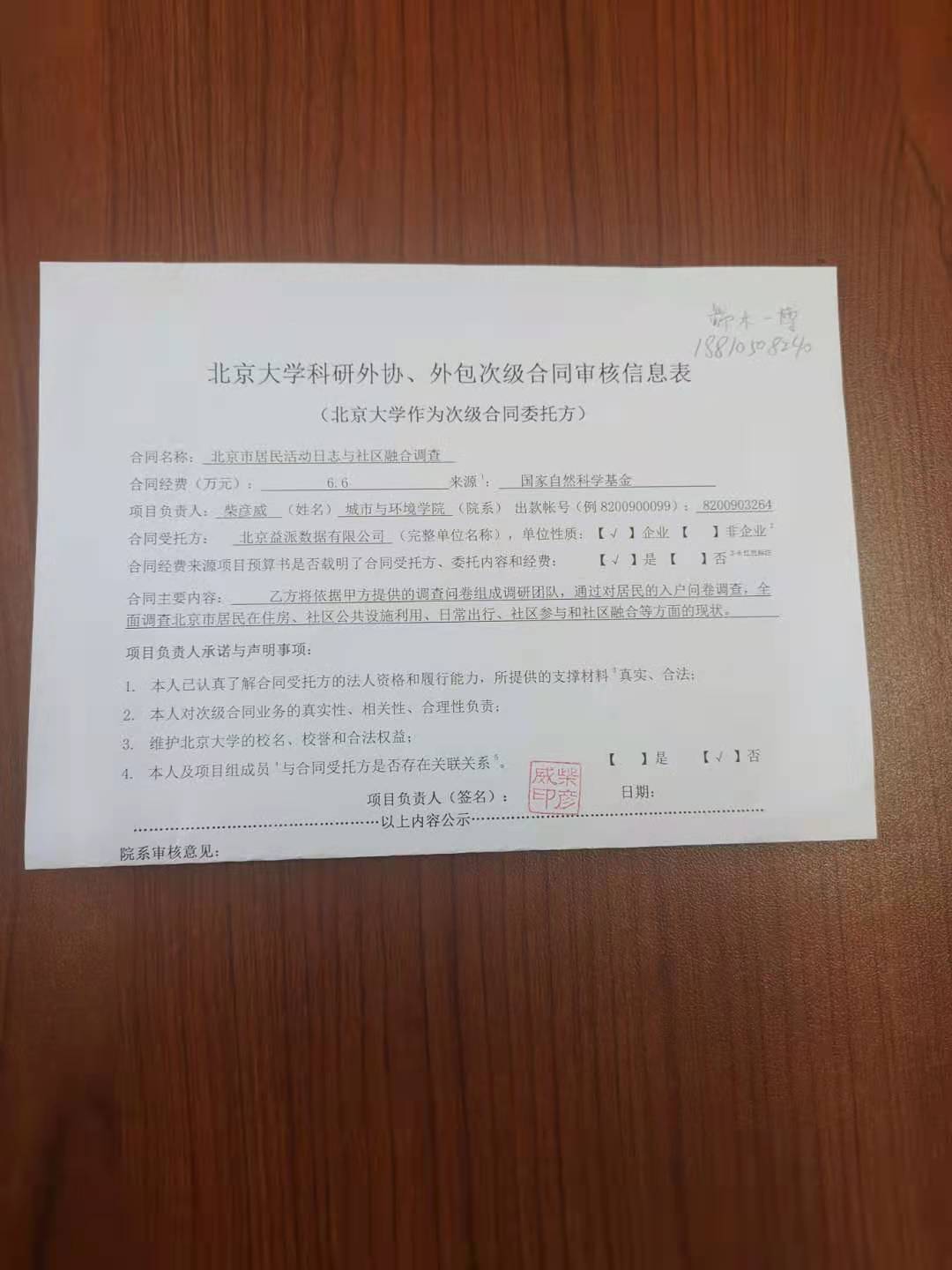 根据《关于北京大学理工科科研次级合同管理的通知》,现将北京大学理工科科研次级合同北京市居民活动日志与社区融合调查”的相关内容予以公示。公示时间:2020年12月11日-2020年15月10日(3个工作日)。合同相关纸质材料可经预约后到勺园5乙330办公室进行查阅。