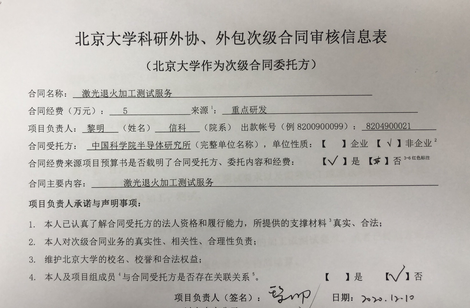 根据《关于北京大学理工科科研次级合同管理的通知》,现将北京大学理工科科研次级合同“激光退火加工测试服务”相关内容予以公示。