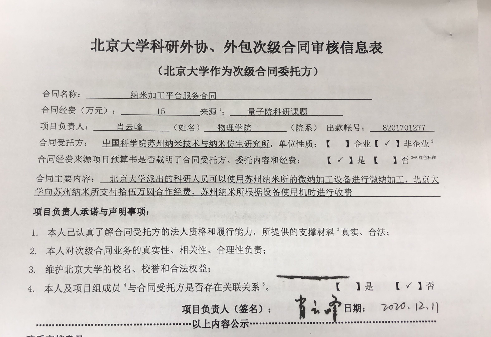 根据《关于北京大学理工科科研次级合同管理的通知》,现将北京大学理工科科研次级合同“纳米加工平台服务合同”相关内容予以公示。
