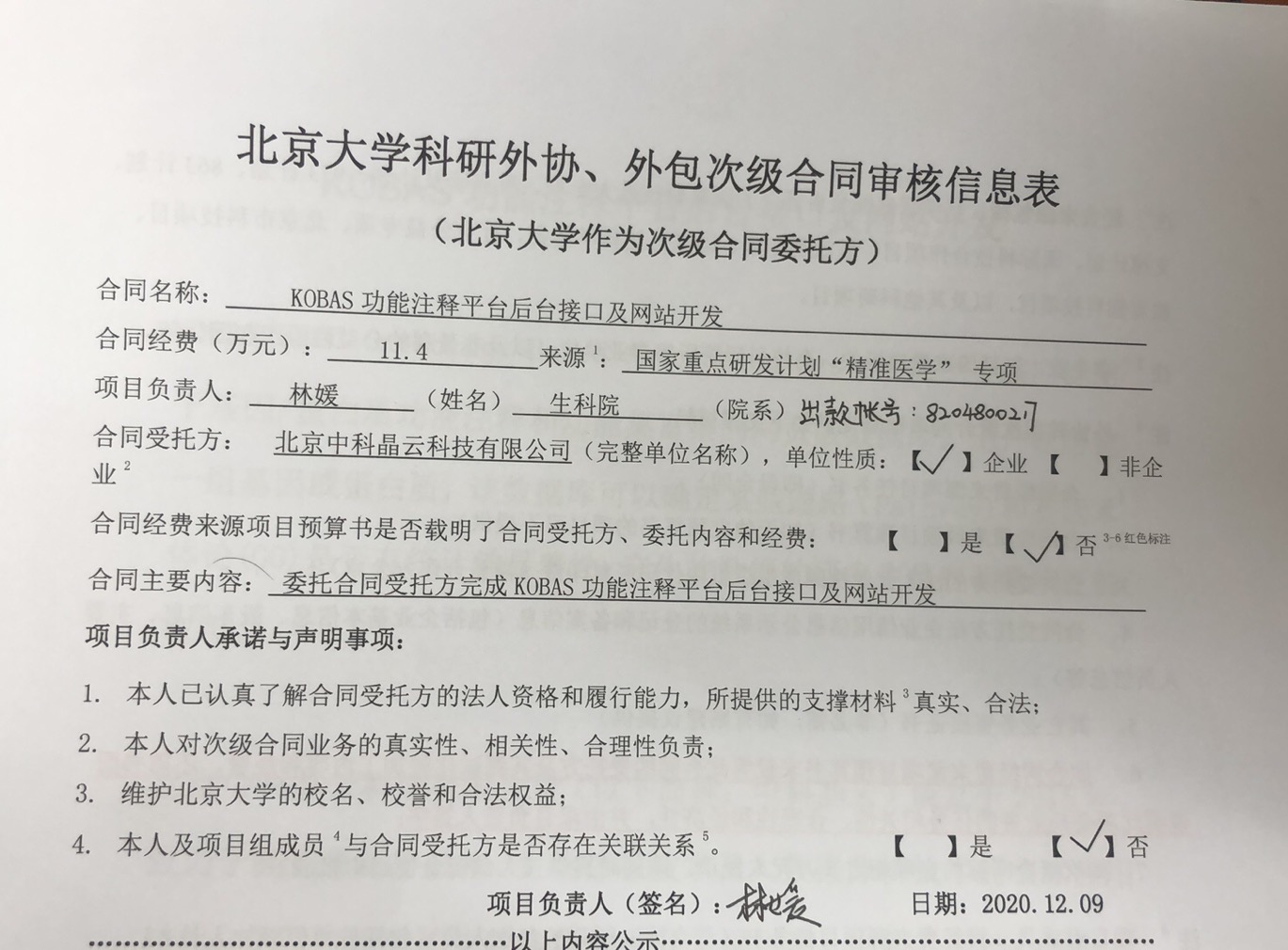 根据《关于北京大学理工科科研次级合同管理的通知》,现将北京大学理工科科研次级合同“KOBAS功能注释平台后台接口及网站开发”相关内容予以公示。