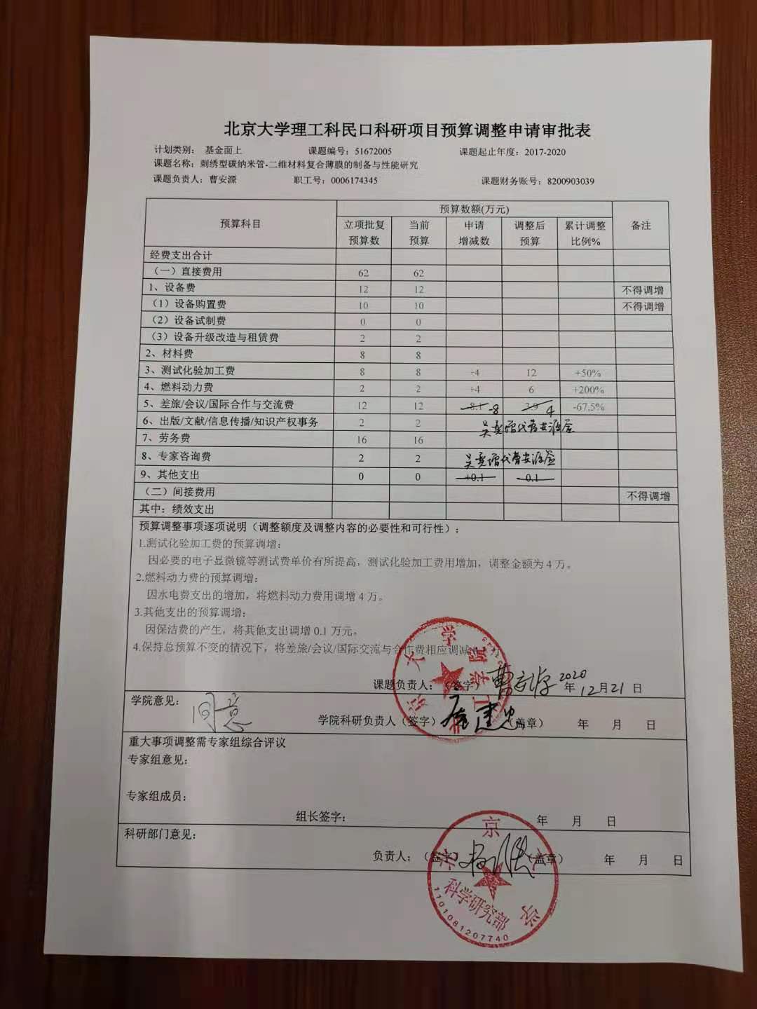 根据《关于实施北京大学理工科民口科研项目预算调剂规定的通知》,现将北京大学理工科民口科研项目“刺绣型碳纳米管-二维材料复合薄膜的制备与性能研究”预算调整申请审批表相关内容予以公示。