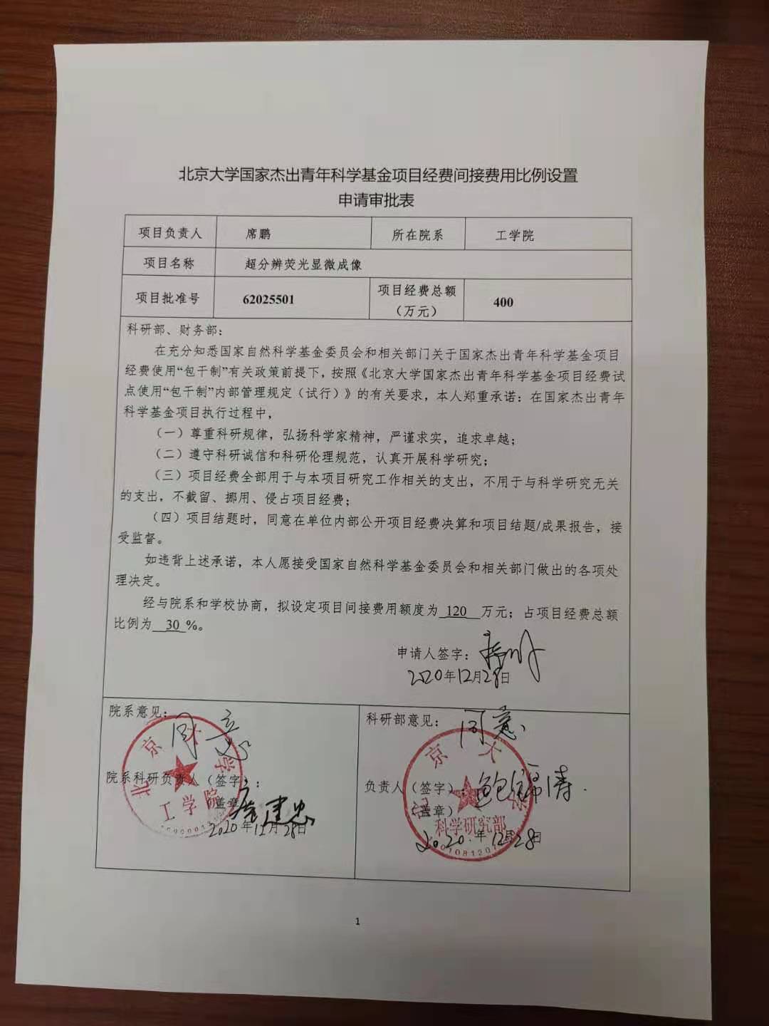 根据《北京大学国家杰出青年科学基金试点项目经费使用“包干制”内部管理规定(试行)》(校发〔2020〕95号),现将席鹏老师的《北京大学国家杰出青年科学基金项目经费间接费用比例设置申请审批表》相关内容予以公示。公示时间:2020年12月28日-2020年12月30日(3个工作日)。