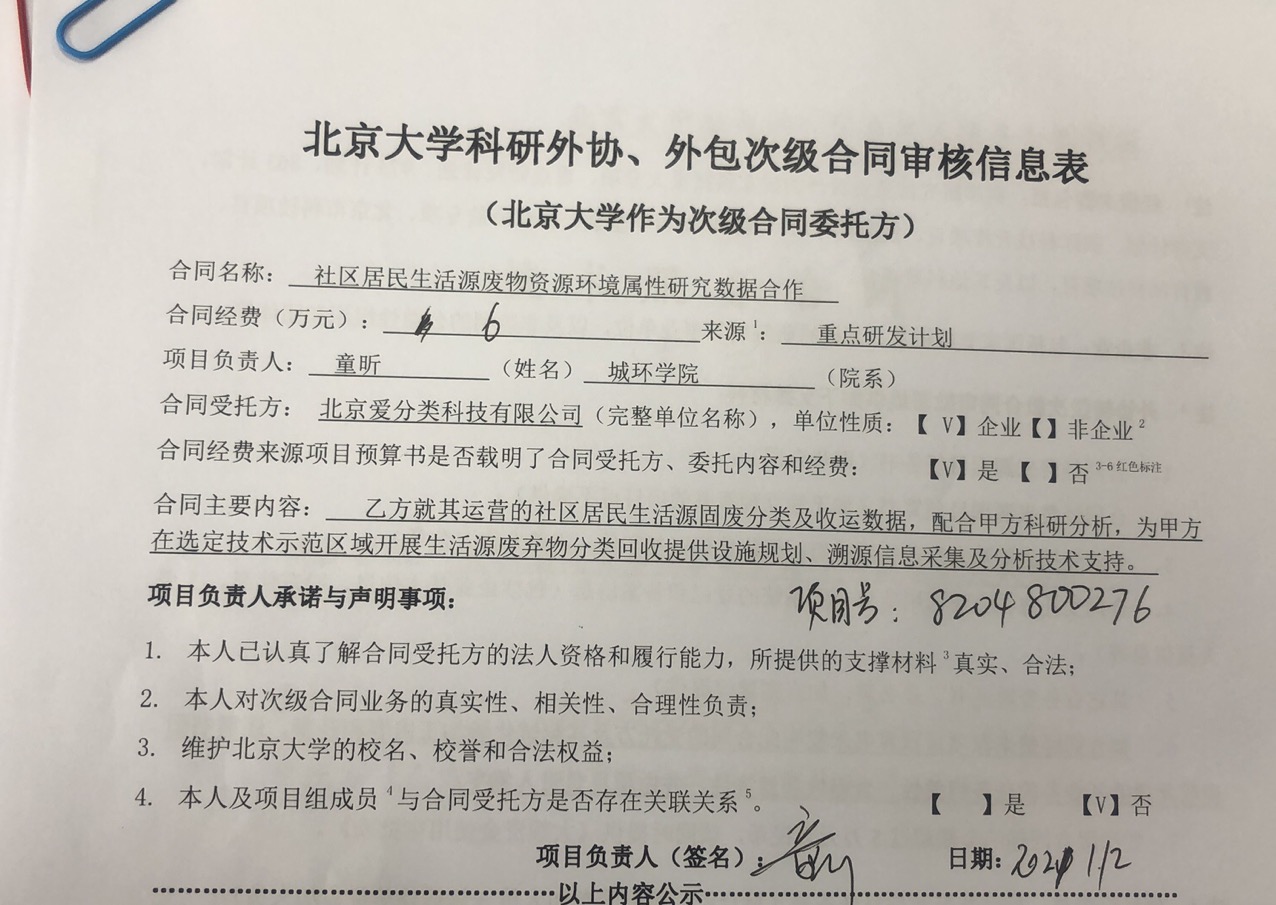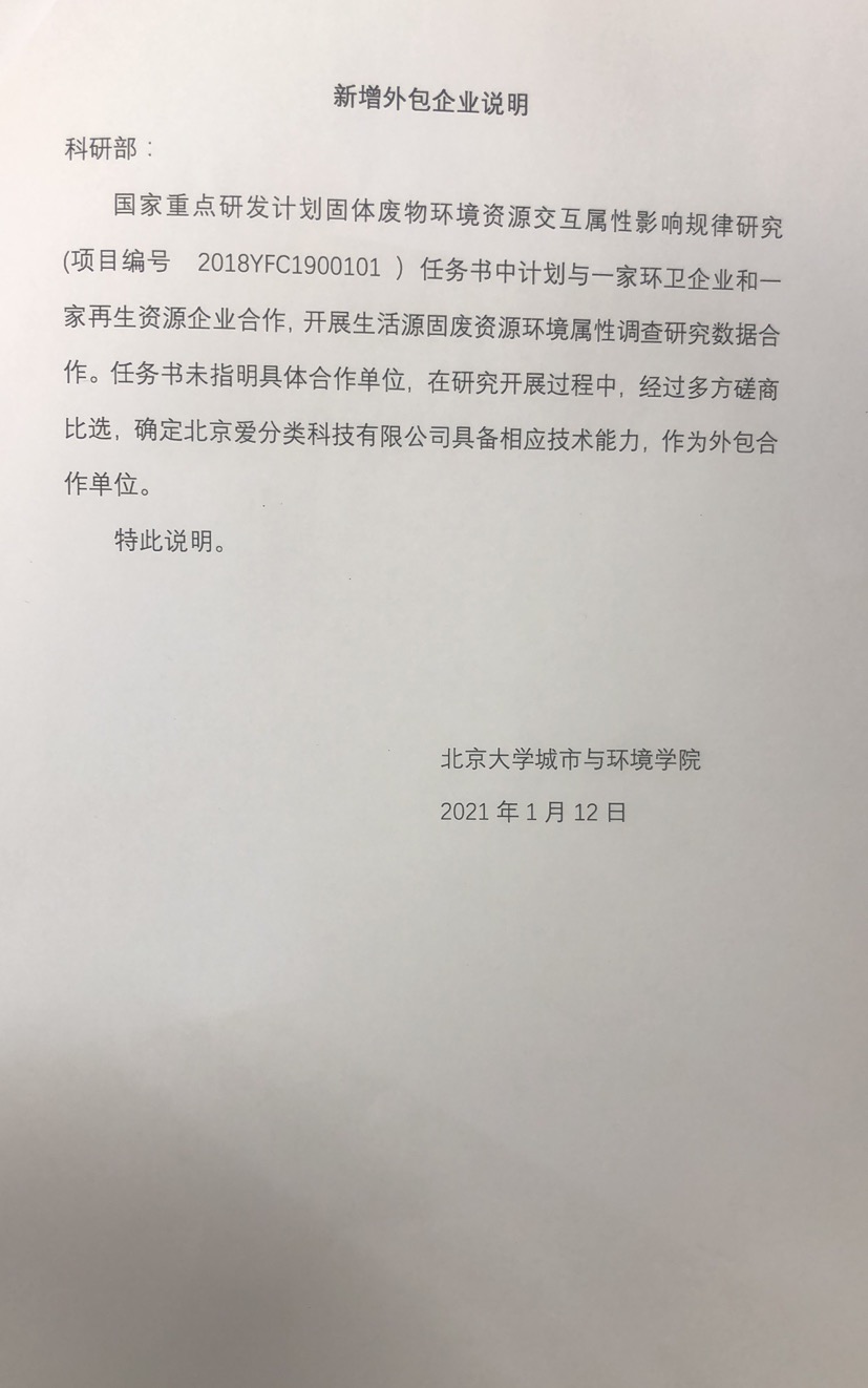 北京大学理工科科研次级合同“社区居民生活源废物资源环境属性研究数据合作”公示