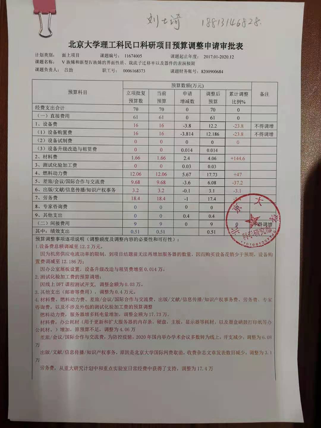 根据《关于实施北京大学理工科民口科研项目预算调剂规定的通知》,现将北京大学理工科民口科研项目“V族烯和新型烯的界面性质、载流子迁移率以及器件的表演极限”预算调整申请审批表相关内容予以公示。