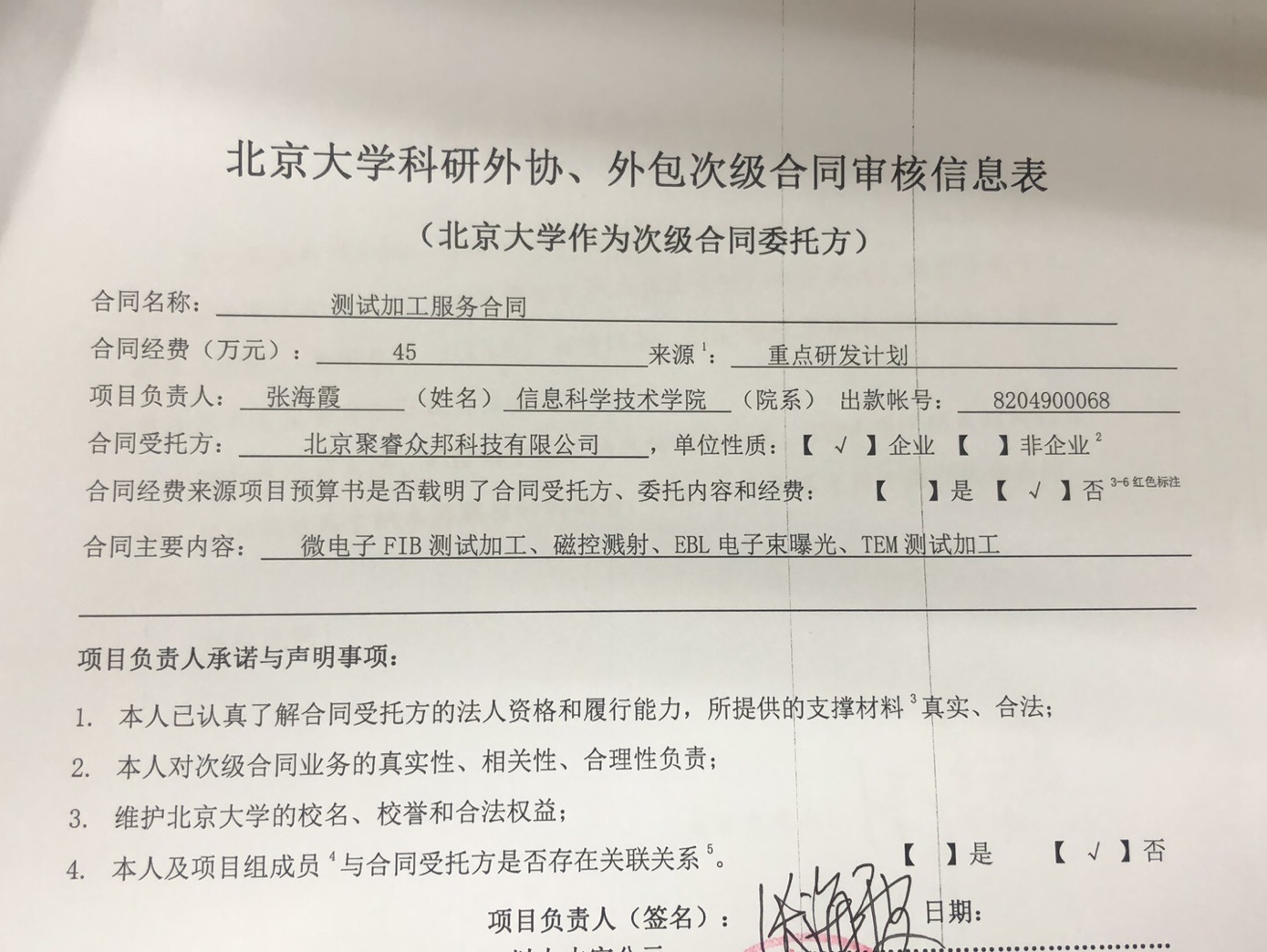 北京大学理工科科研次级合同“测试加工服务合同”公示