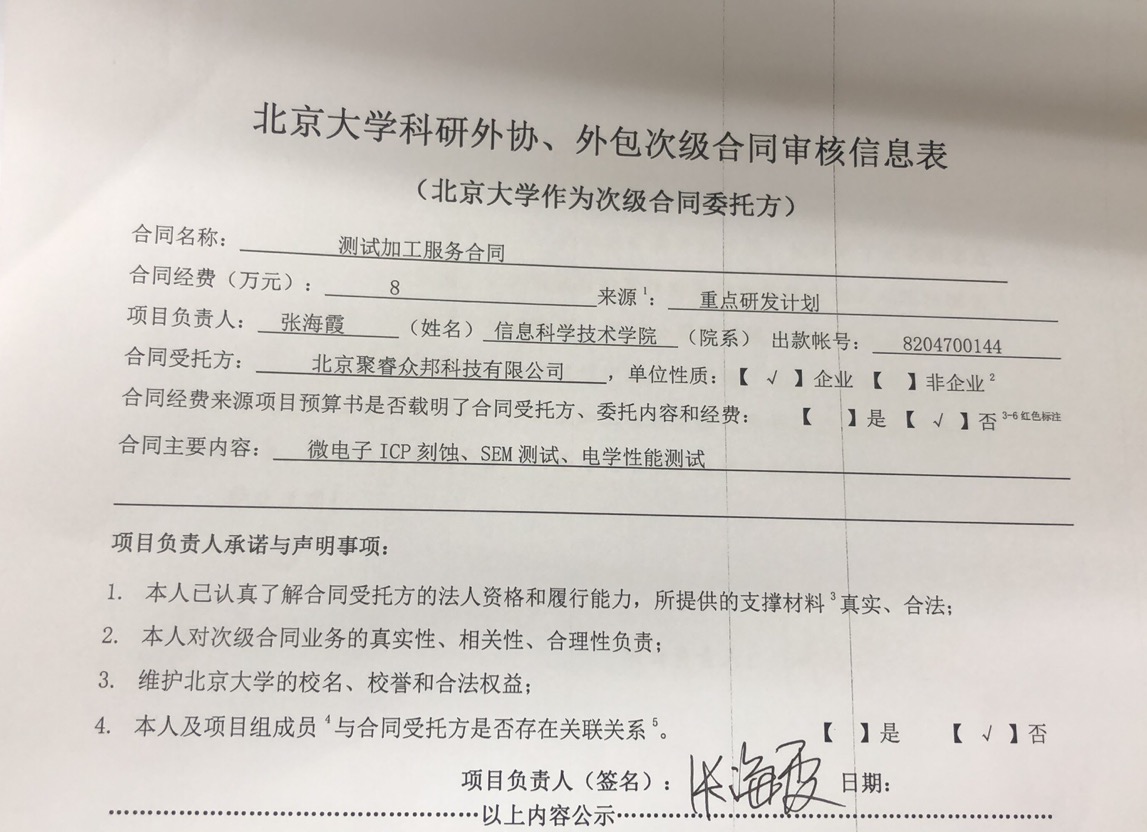根据《关于北京大学理工科科研次级合同管理的通知》,现将北京大学理工科科研次级合同“测试加工服务合同”相关内容予以公示。