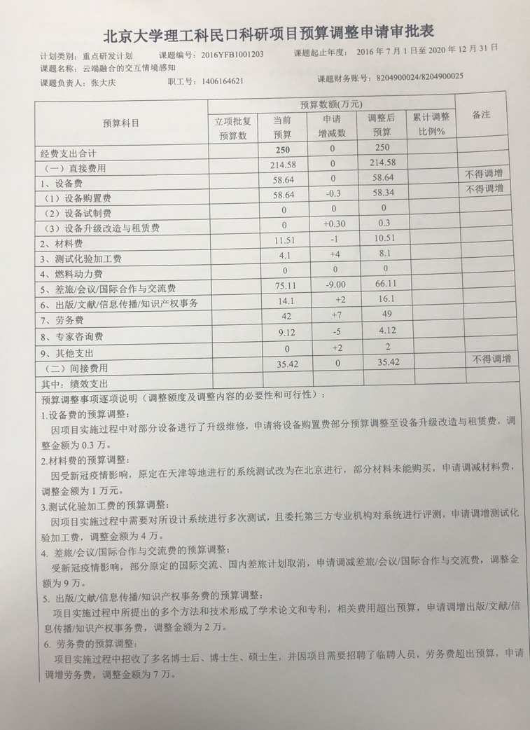 根据《关关于实施北京大学理工科民口科研项目预算调剂规定的通知》,现将北京大学理工科民口科研项目“云端融合的交互情境感知”预算调整申请审批表相关内容予以公示。