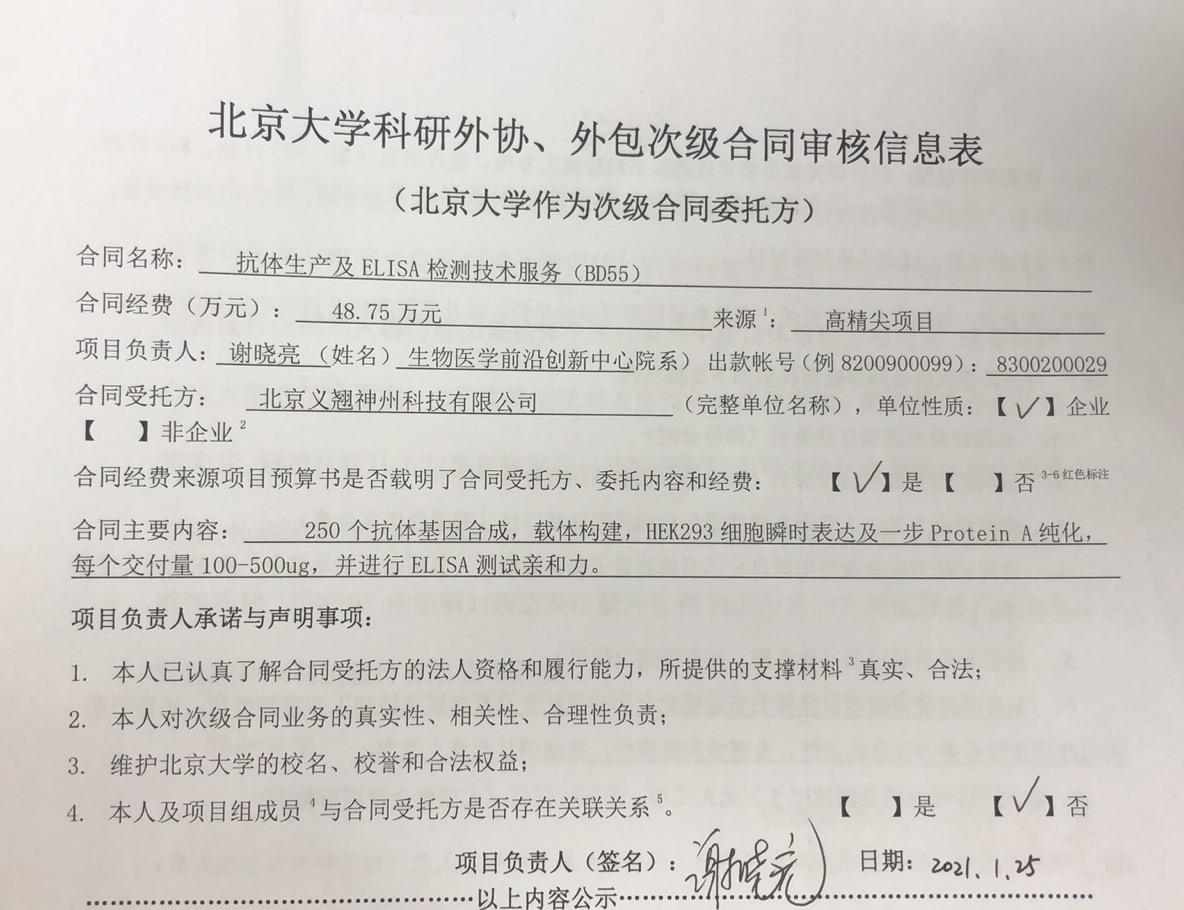 根据《关于北京大学理工科科研次级合同管理的通知》,现将北京大学理工科科研次级合同“抗体生产及ELISA检测技术服务”相关内容予以公示。