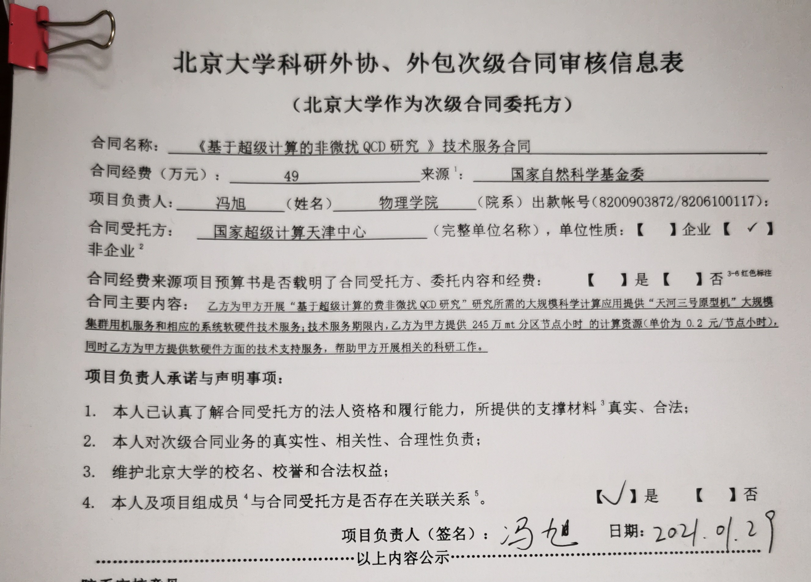 根据《关于北京大学理工科科研次级合同管理的通知》,现将北京大学理工科科研次级合同“基于超级计算的非微扰QCD研究技术服务合同”的相关内容予以公示。公示时间:2021年02月1日-2021年02月3日(3个工作日)。合同相关纸质材料可经预约后到勺园5乙330办公室进行查阅。
