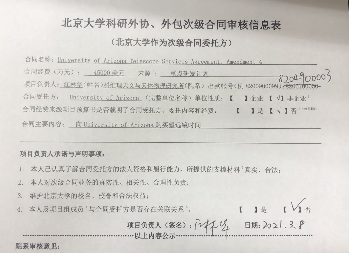 根据《关于北京大学理工科科研次级合同管理的通知》,现将北京大学理工科科研次级合同“University of Arizona Telescope Services Agreement, Amendment 4”相关内容予以公示。