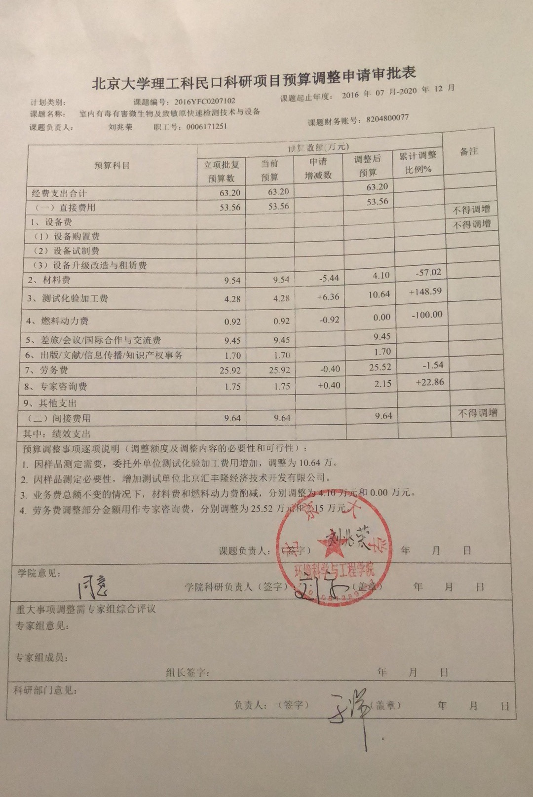 根据《关于实施北京大学理工科民口科研项目预算调剂规定的通知》,现将北京大学理工科民口科研项目“室内有毒有害微生物及致敏原快速检测技术与设备”预算调整申请审批表相关内容予以公示。