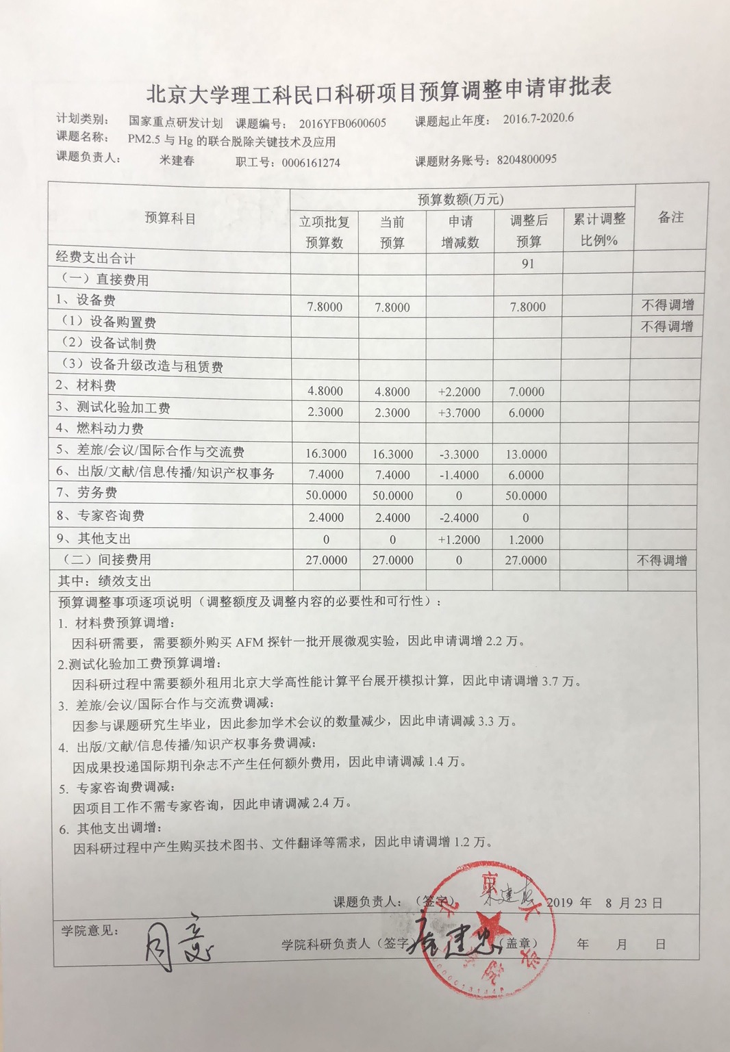 根据《关于实施北京大学理工科民口科研项目预算调剂规定的通知》,现将北京大学理工科民口科研项目“PM2.5与Hg的联合脱除关键技术及应用”预算调整申请审批表相关内容予以公示。