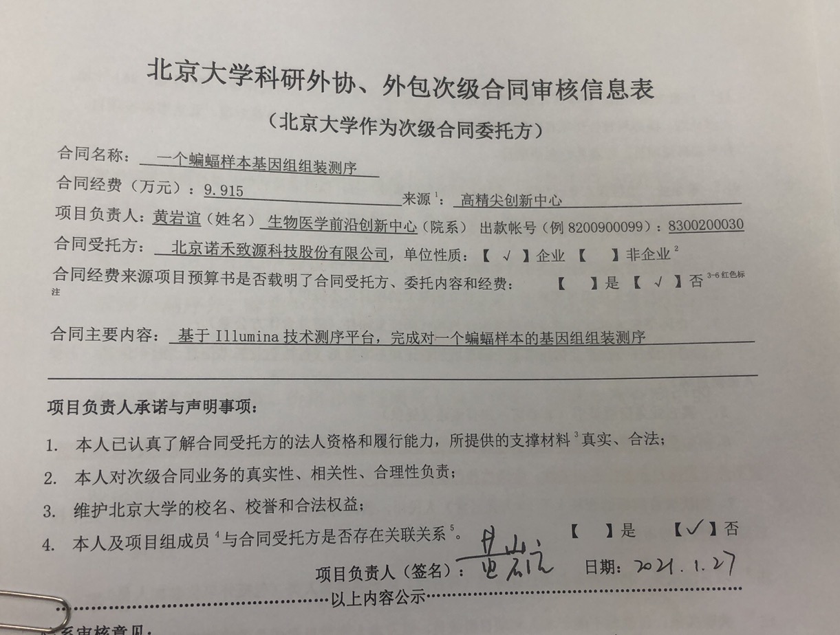 根据《关于北京大学理工科科研次级合同管理的通知》,现将北京大学理工科科研次级合同“一个蝙蝠样本基因组组装测序”相关内容予以公示。
