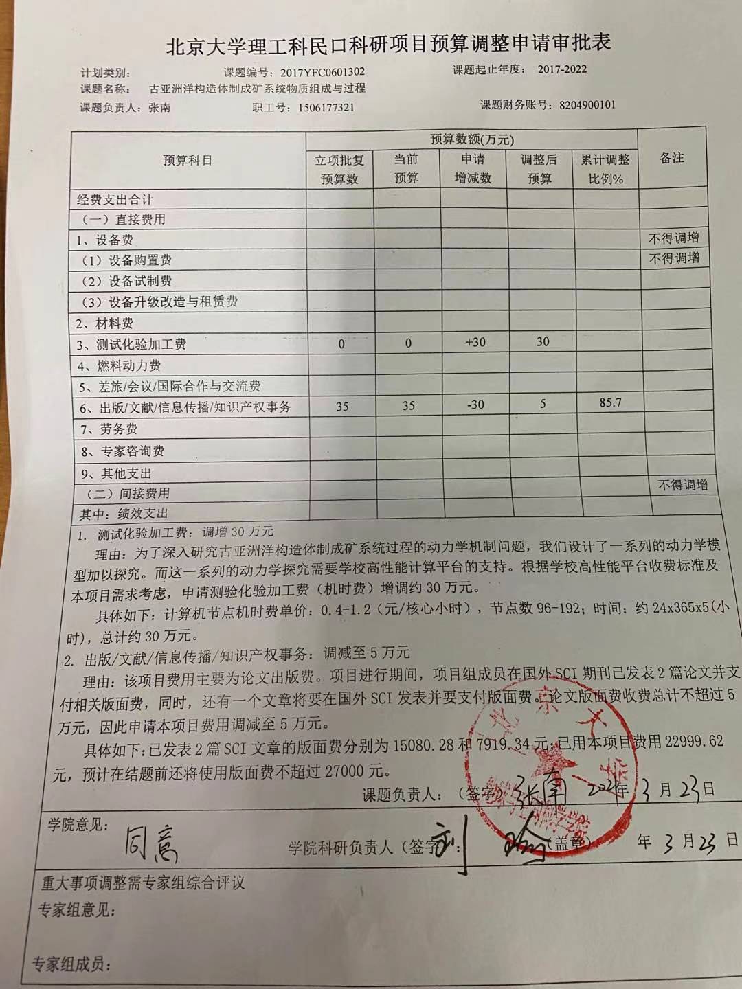 根据《关于实施北京大学理工科民口科研项目预算调剂规定的通知》,现将北京大学理工科民口科研项目“古亚洲洋构造体制成矿系统物质组成与过程”预算调整申请审批表相关内容予以公示。