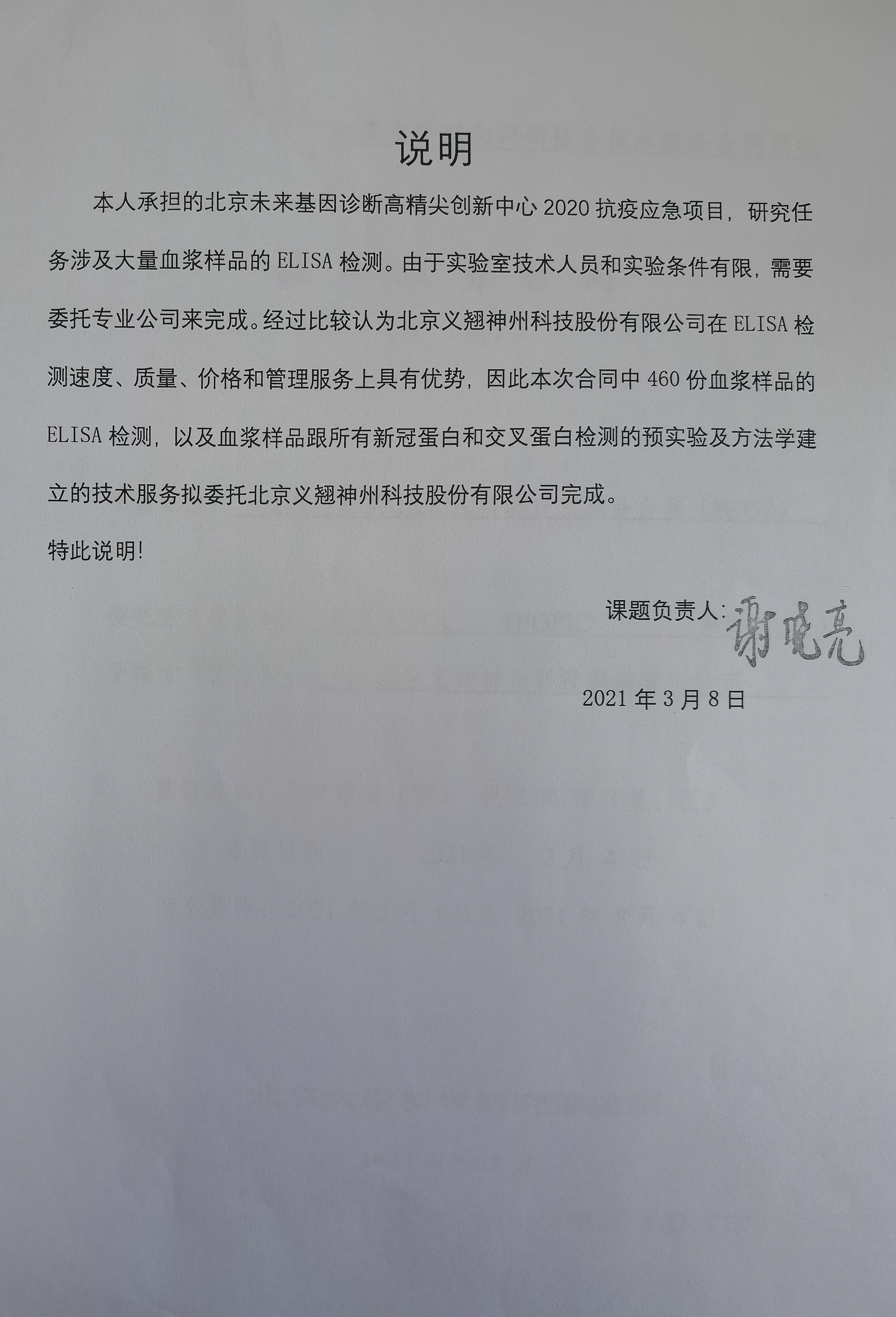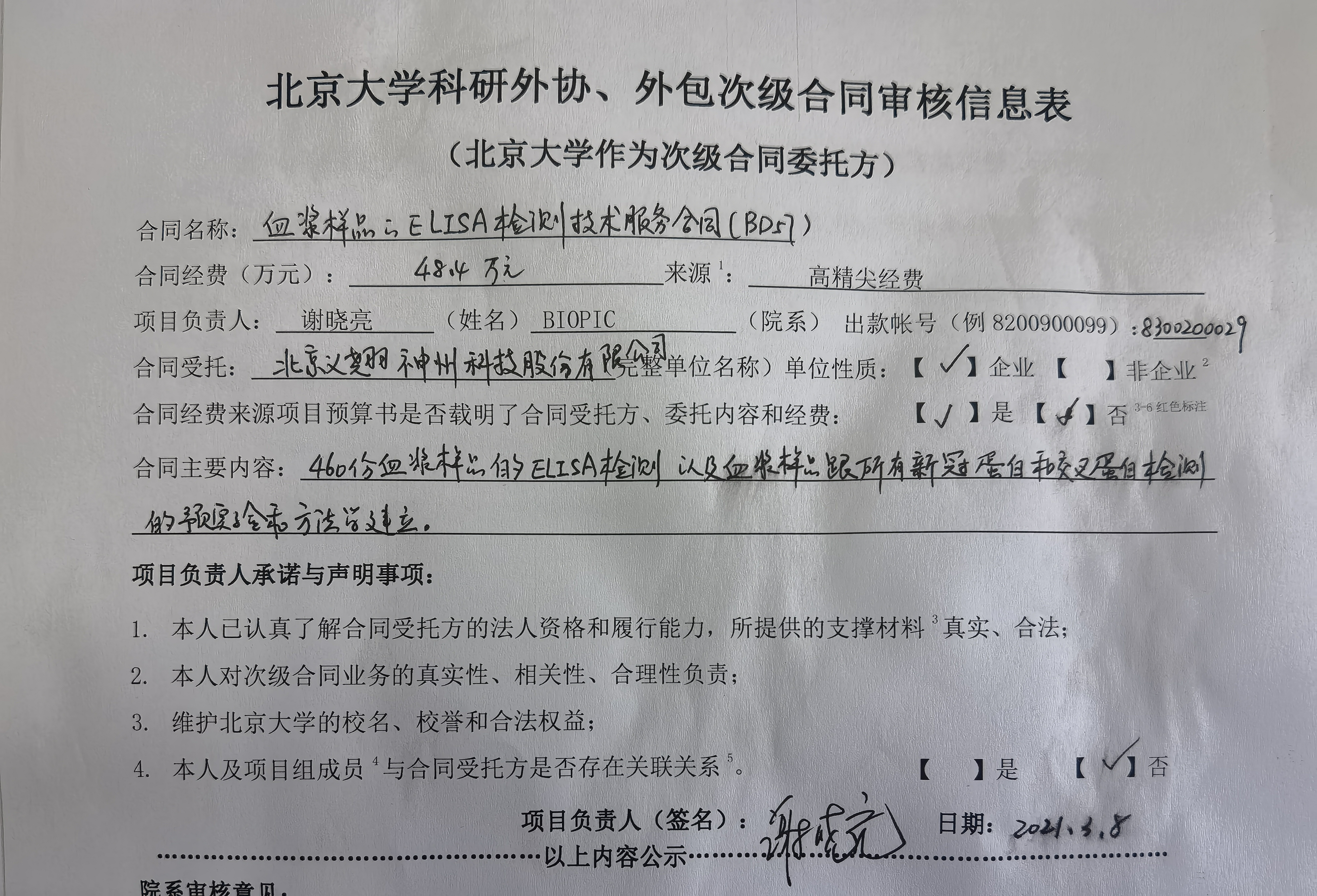 根据《关于北京大学理工科科研次级合同管理的通知》,现将北京大学理工科科研次级合同血浆样品的ELISA检测技术服务合同”的相关内容予以公示。公示时间:2021年03月25日-2021年03月29日(3个工作日)。合同相关纸质材料可经预约后到勺园5乙330办公室进行查阅。