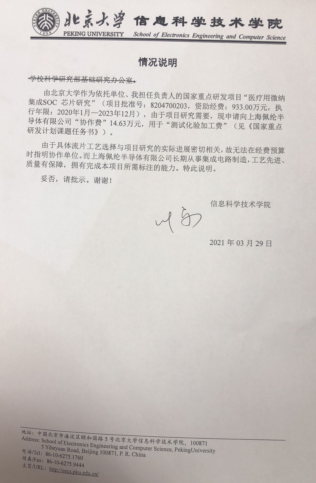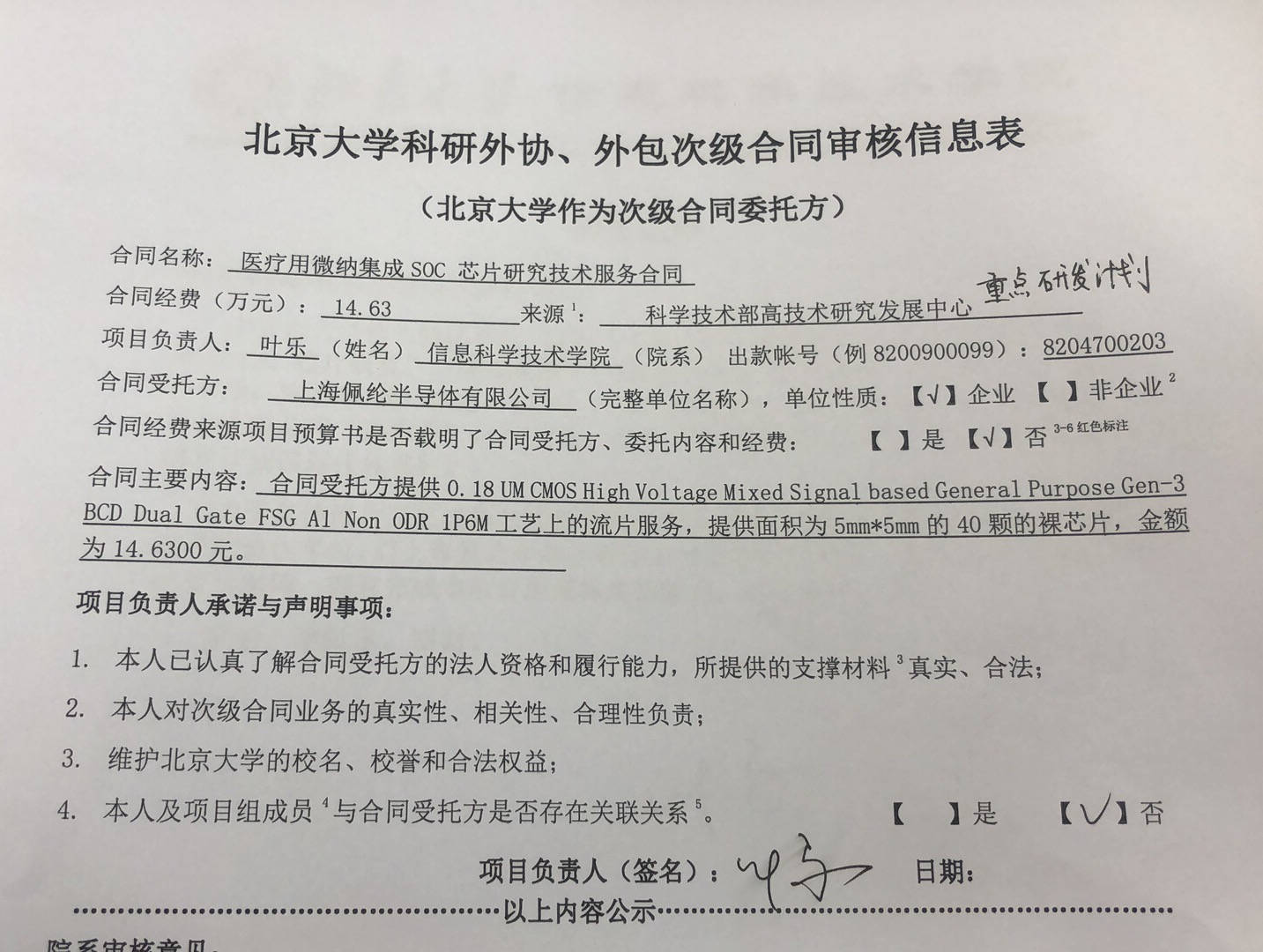 根据《关于北京大学理工科科研次级合同管理的通知》,现将北京大学理工科科研次级合同“医疗用微纳集成SOC芯片研究技术服务合同”相关内容予以公示。