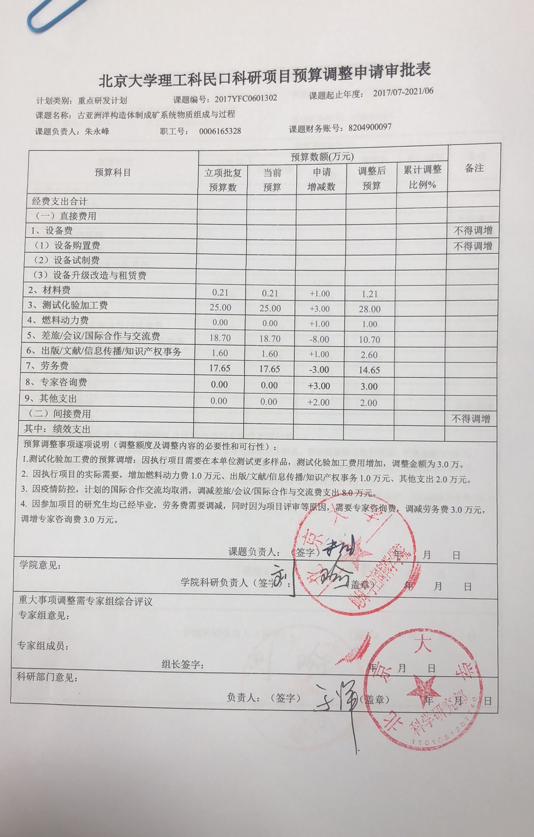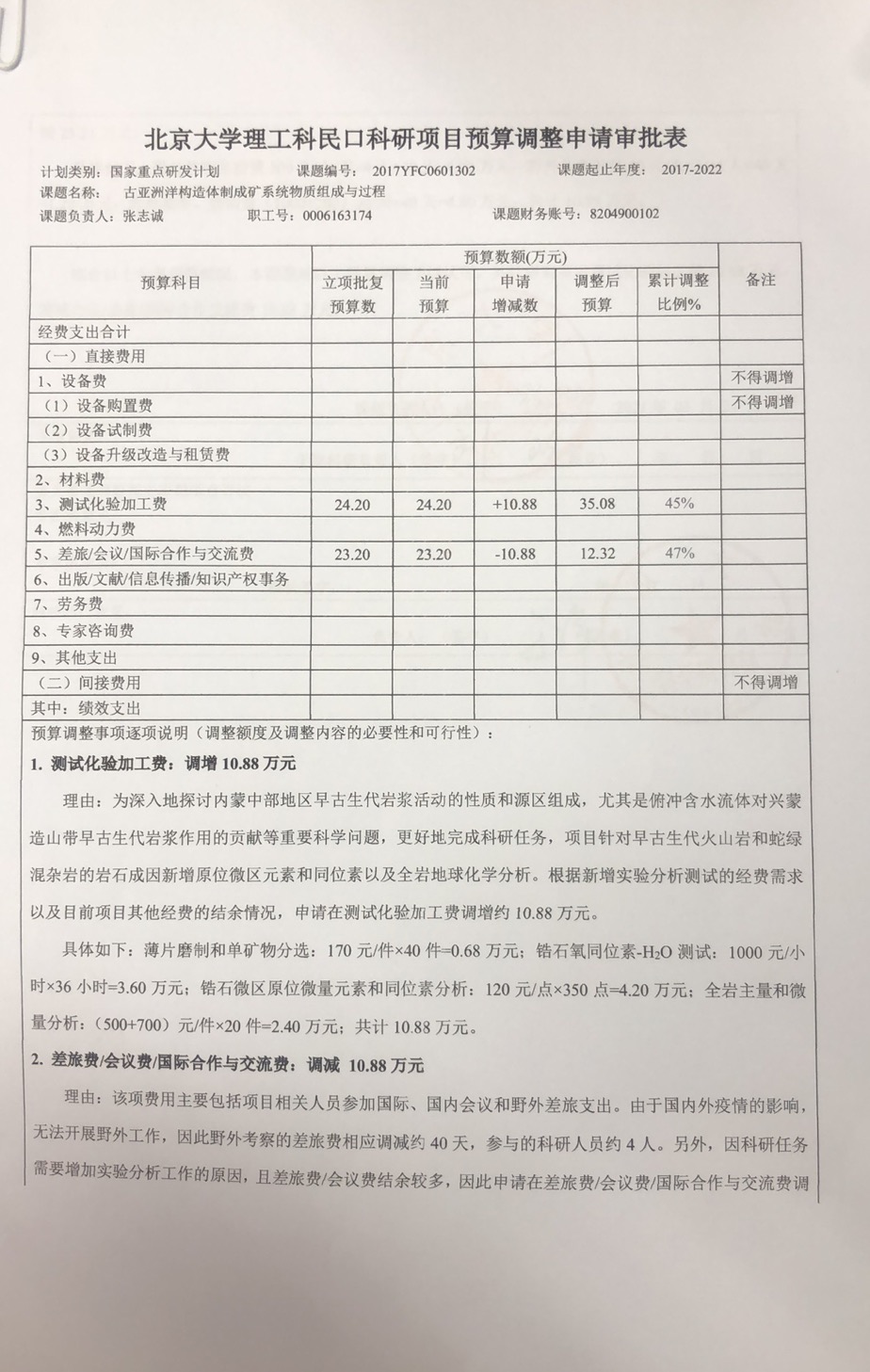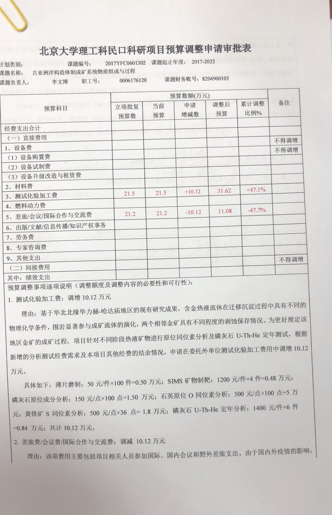 根据《关于实施北京大学理工科民口科研项目预算调剂规定的通知》,现将北京大学理工科民口科研项目“古亚洲洋构造体制成矿系统物质组成与过程”预算调整申请审批表相关内容予以公示。