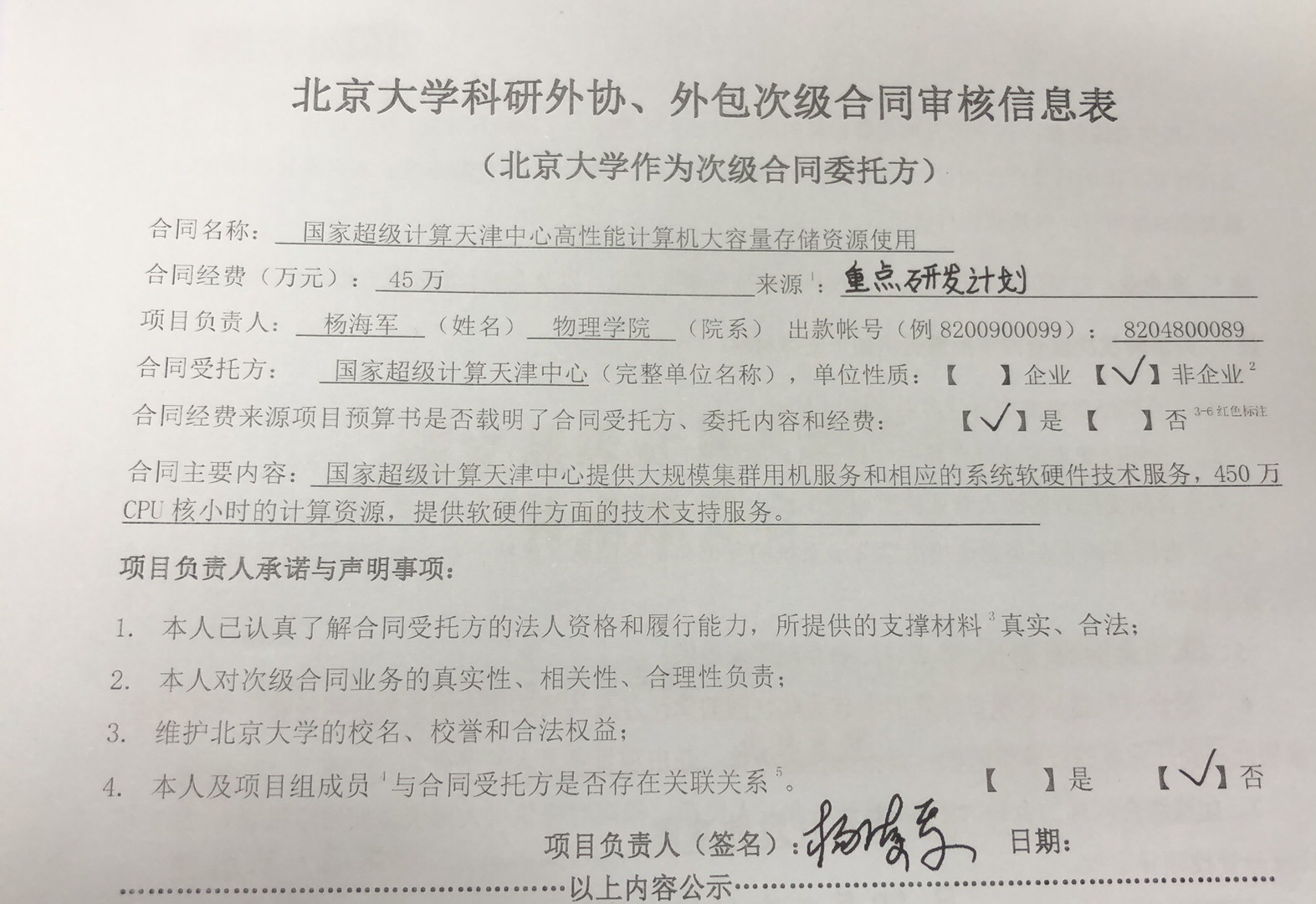 根据《关于北京大学理工科科研次级合同管理的通知》,现将北京大学理工科科研次级合同“国家超级计算天津中心高性能计算机大容量存储资源使用”相关内容予以公示。