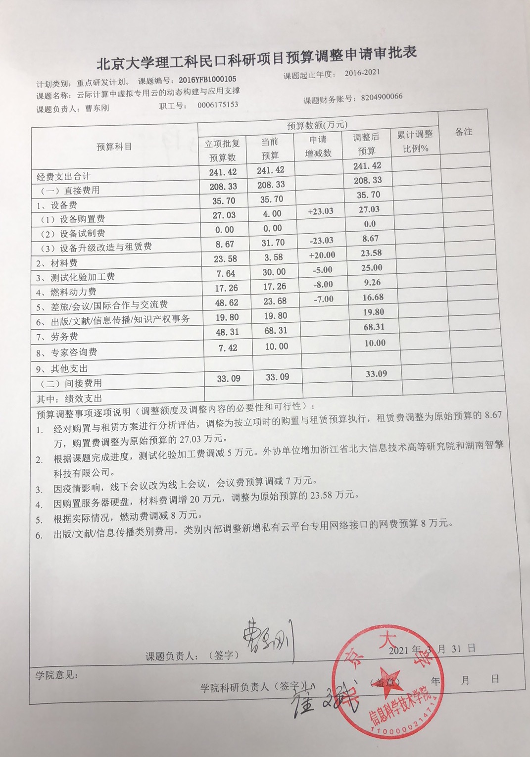 根据《关于实施北京大学理工科民口科研项目预算调剂规定的通知》,现将北京大学理工科民口科研项目“云际计算中虚拟专用云的动态构建与应用支撑”预算调整申请审批表相关内容予以公示。
