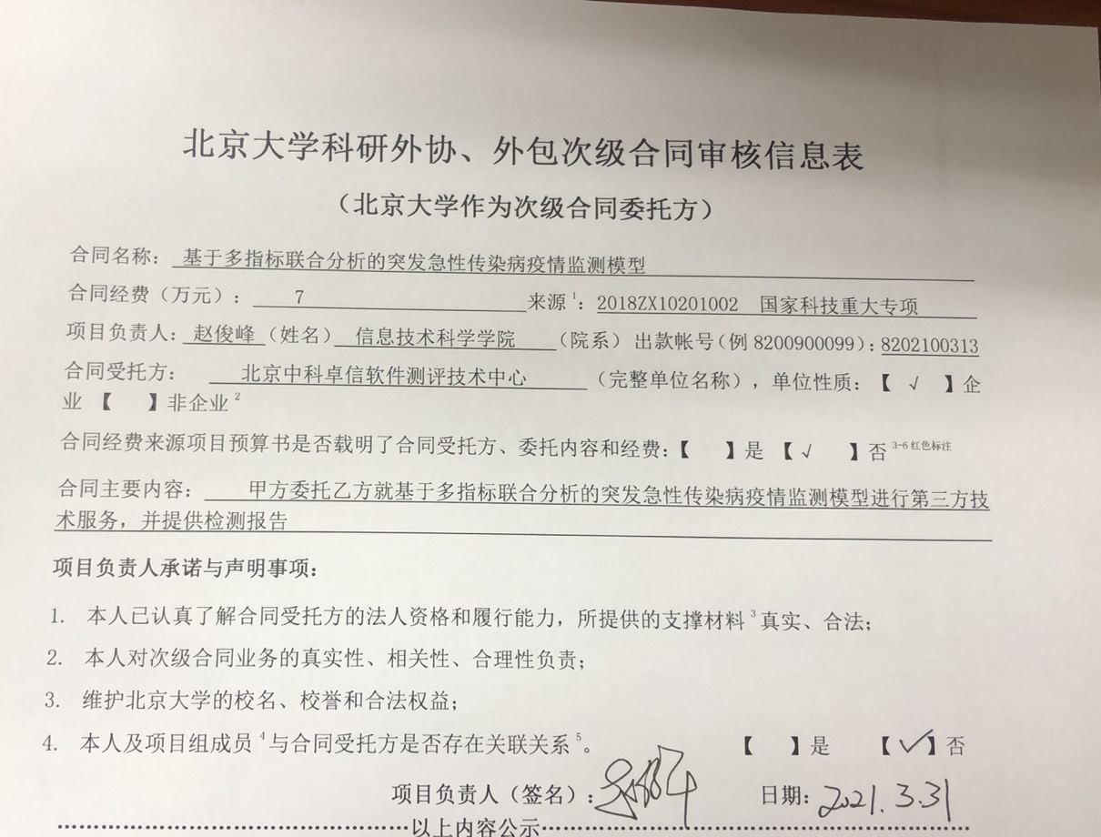 根据《关于北京大学理工科科研次级合同管理的通知》,现将北京大学理工科科研次级合同“基于多指标联合分析的突发急性传染病疫情监测模型”相关内容予以公示。