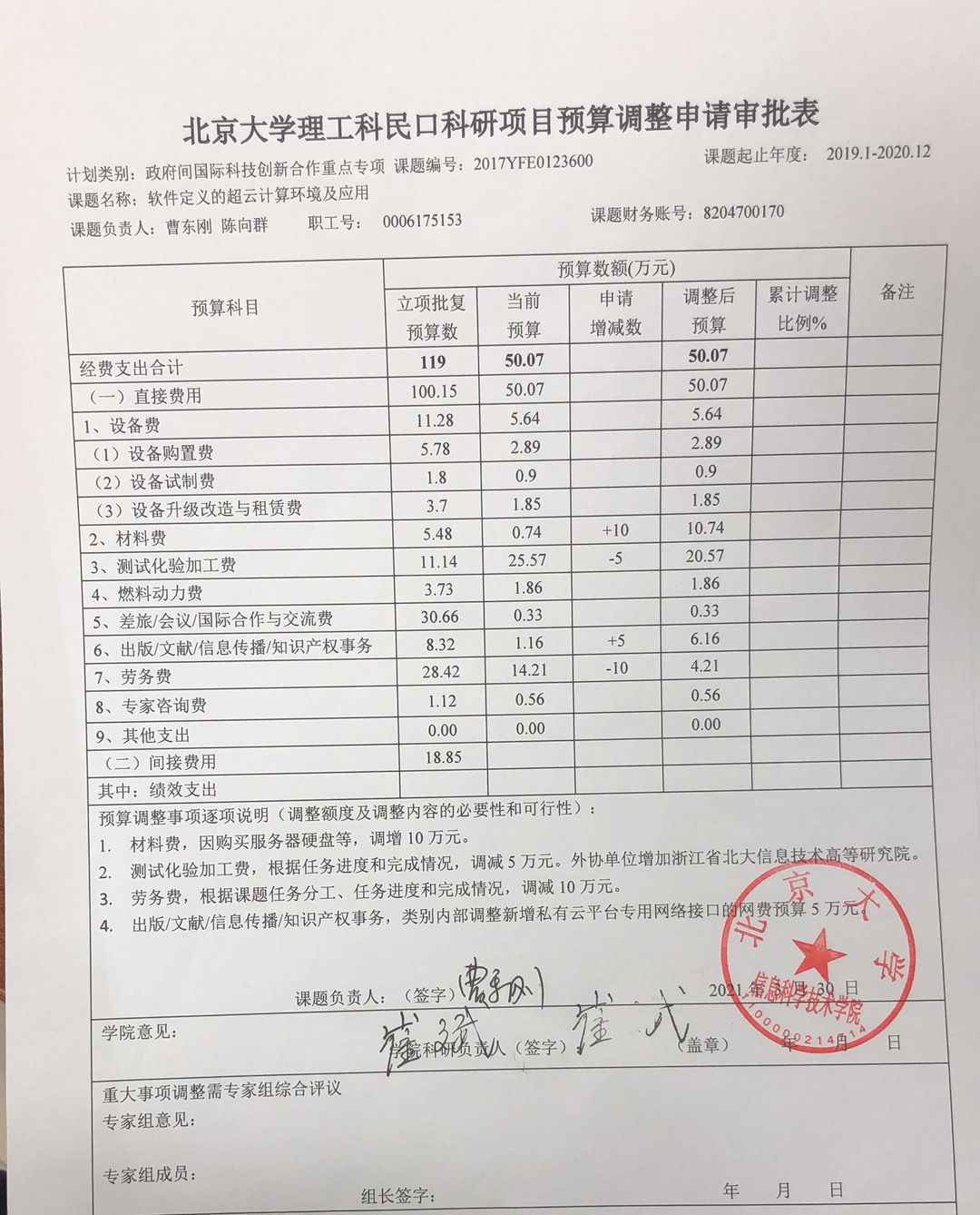 根据《关于实施北京大学理工科民口科研项目预算调剂规定的通知》,现将北京大学理工科民口科研项目“软件定义的超云计算环境及应用”预算调整申请审批表相关内容予以公示。