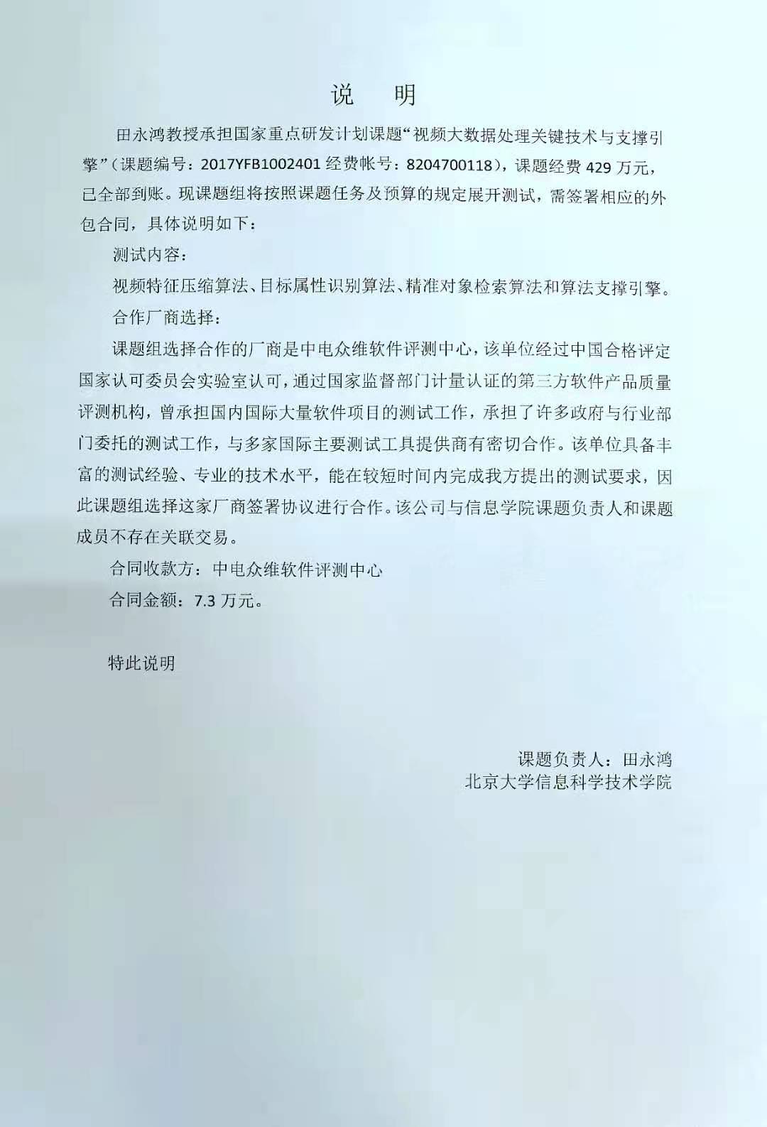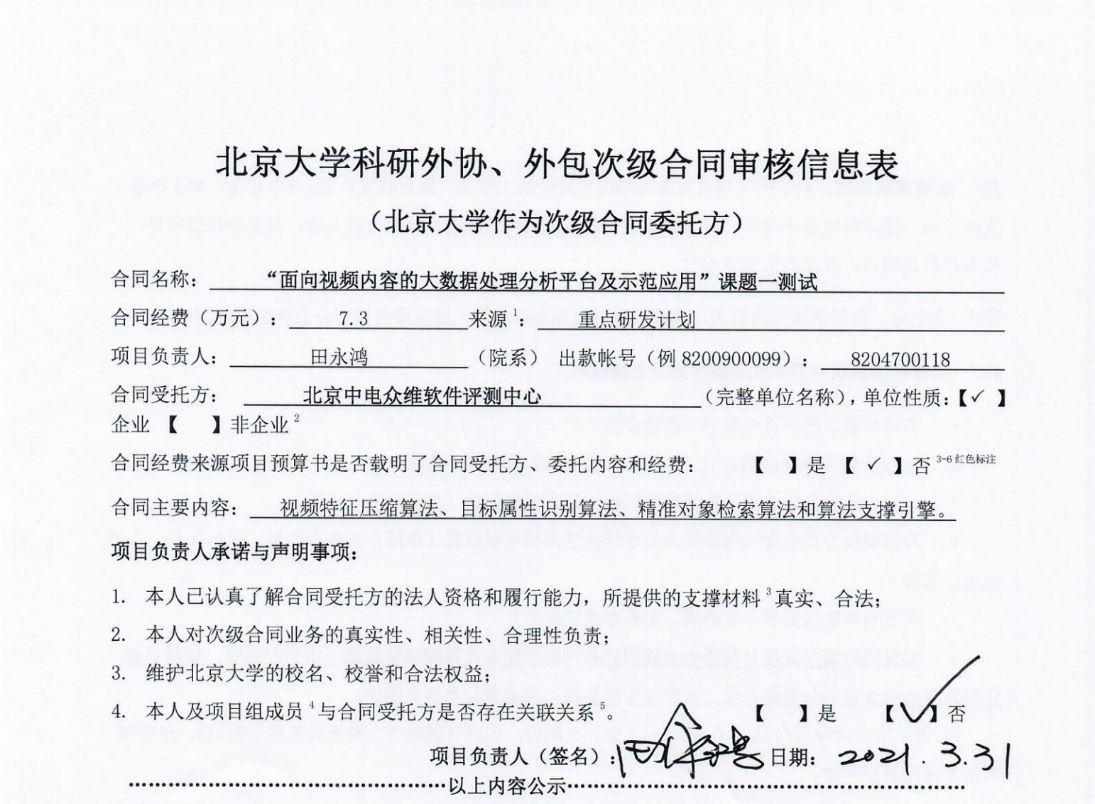 根据《关于北京大学理工科科研次级合同管理的通知》,现将北京大学理工科科研次级合同“‘面向视频内容的大数据处理分析平台及示范应用’课题一测试”相关内容予以公示。