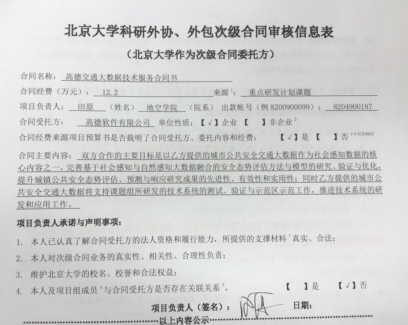 根据《关于北京大学理工科科研次级合同管理的通知》,现将北京大学理工科科研次级合同“高德交通大数据技术服务合同书”相关内容予以公示。