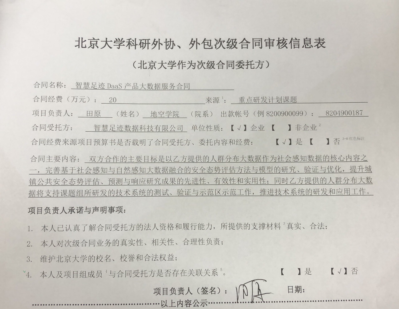 根据《关于北京大学理工科科研次级合同管理的通知》,现将北京大学理工科科研次级合同“智慧足迹DaaS产品大数据服务合同”相关内容予以公示。