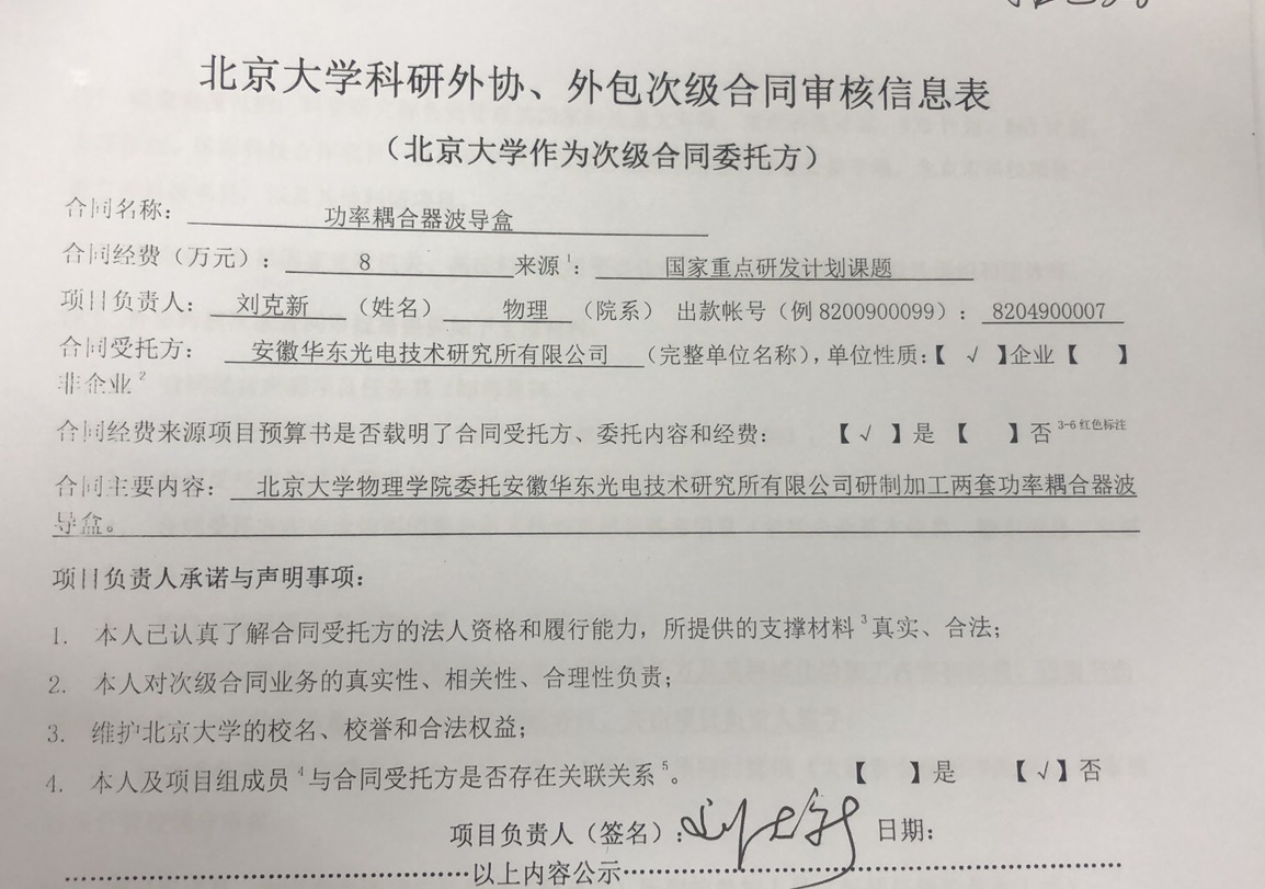 根据《关于北京大学理工科科研次级合同管理的通知》,现将北京大学理工科科研次级合同“功率耦合器波导盒”相关内容予以公示。