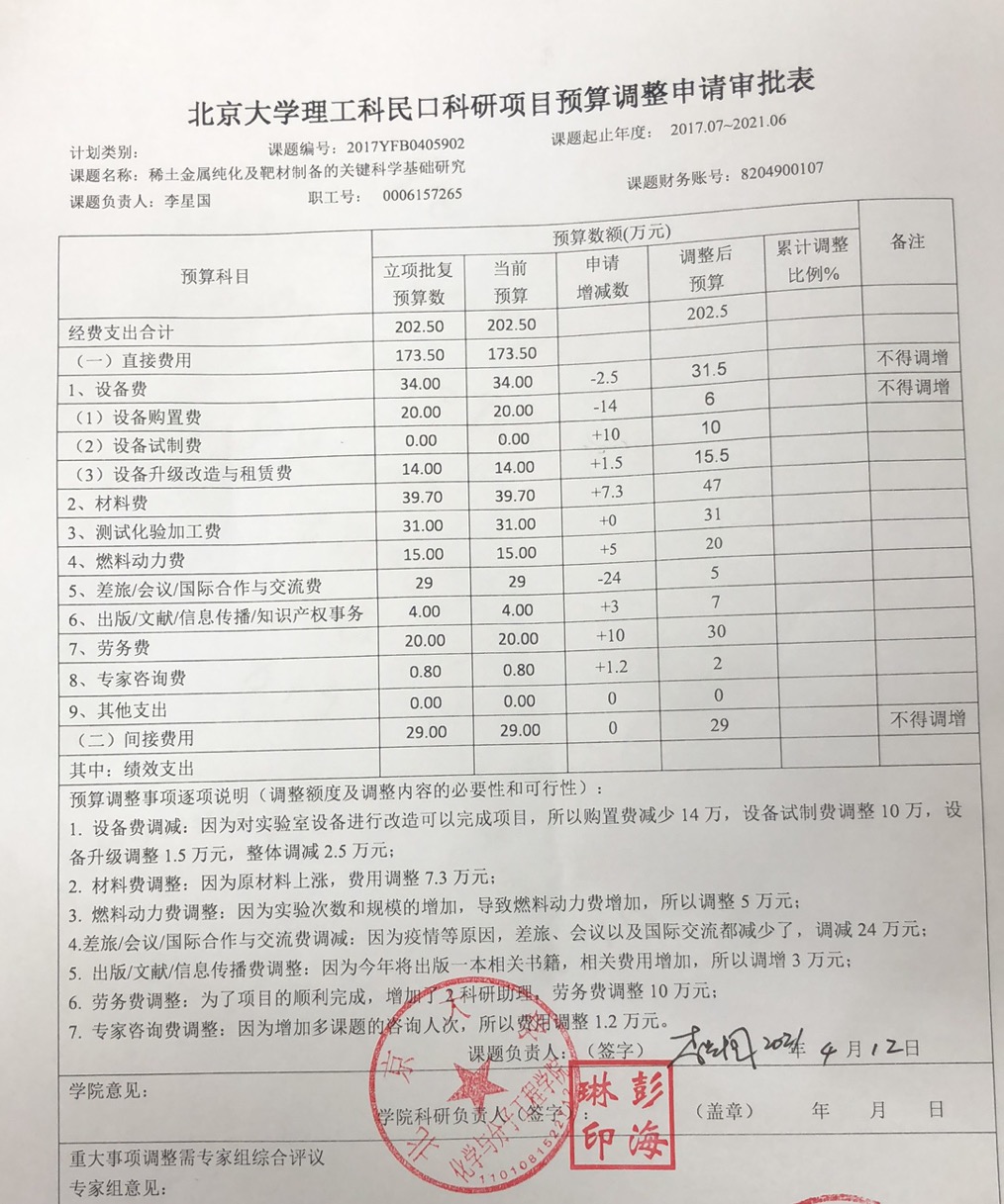 根据《关于实施北京大学理工科民口科研项目预算调剂规定的通知》,现将北京大学理工科民口科研项目“稀土金属纯化及靶材制备的关键科学基础研究”预算调整申请审批表相关内容予以公示。