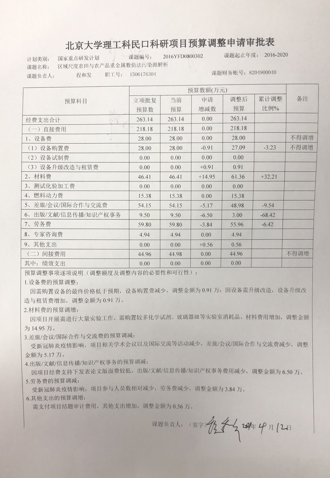 根据《关于实施北京大学理工科民口科研项目预算调剂规定的通知》,现将北京大学理工科民口科研项目“区域尺度农田与农产品重金属数值法污染源解析”预算调整申请审批表相关内容予以公示。