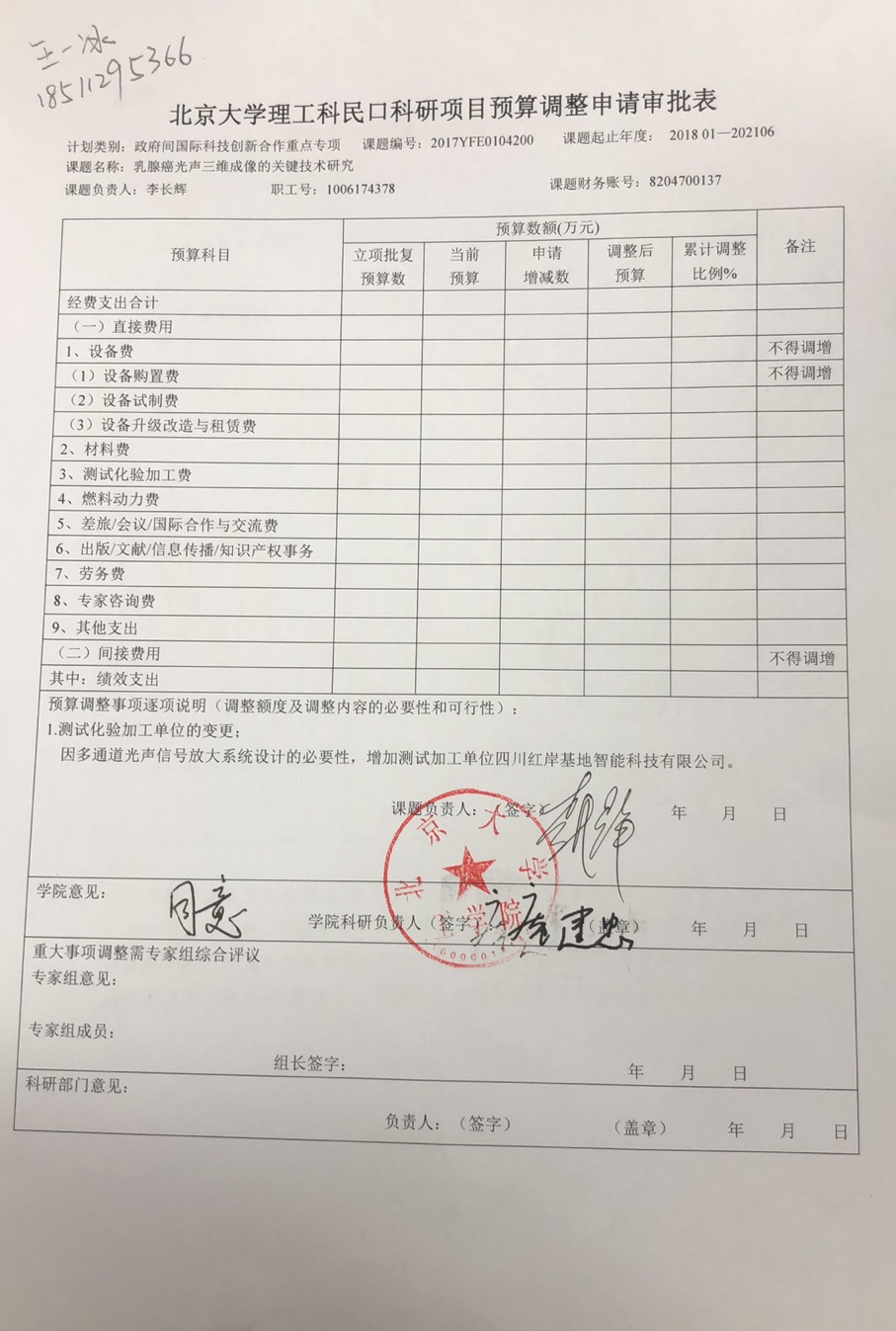 根据《关于实施北京大学理工科民口科研项目预算调剂规定的通知》,现将北京大学理工科民口科研项目“乳腺癌光声三维成像的关键技术研究”预算调整申请审批表相关内容予以公示。
