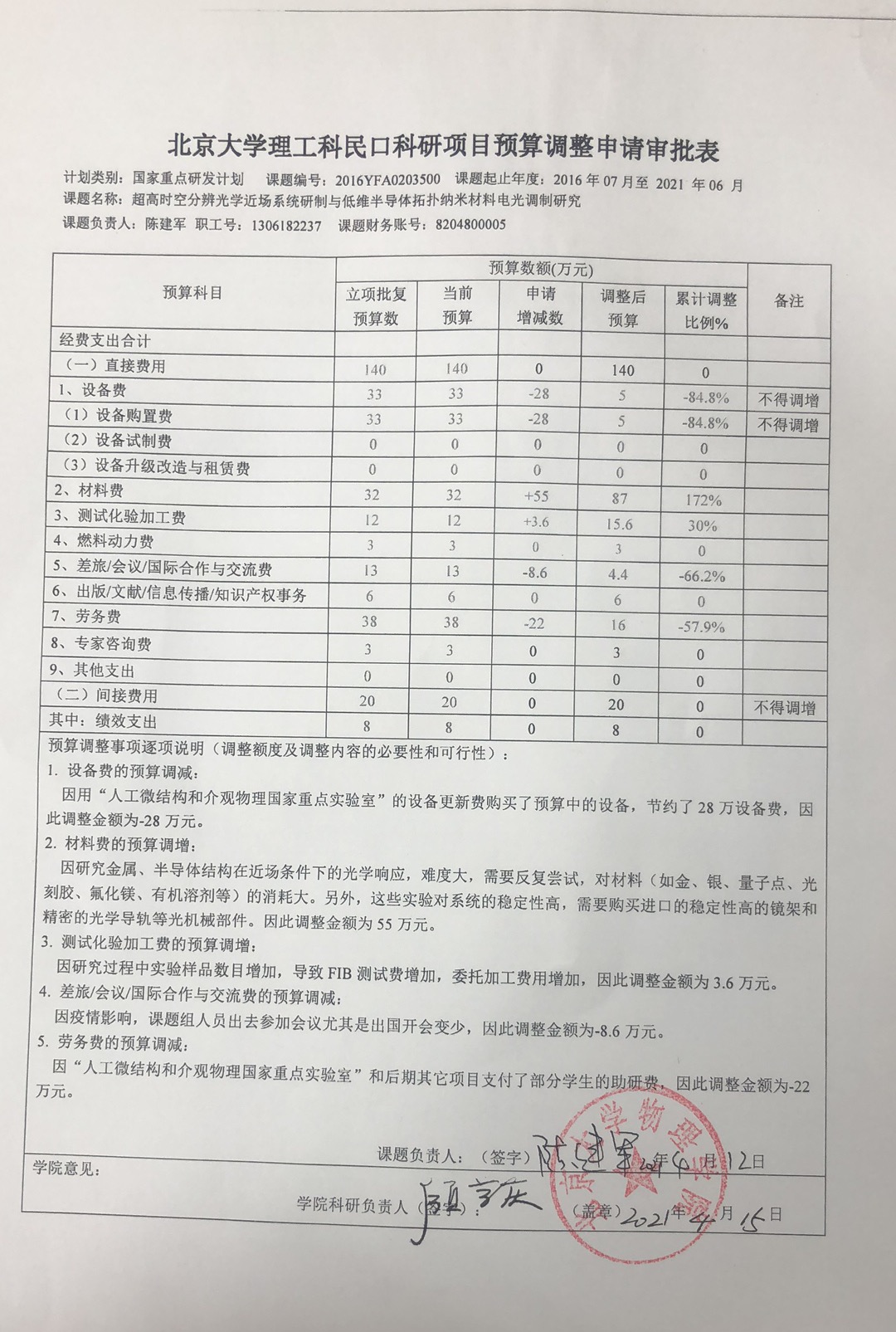 根据《关于实施北京大学理工科民口科研项目预算调剂规定的通知》,现将北京大学理工科民口科研项目“超高时空分辨光学近场系统研制与低维半导体拓扑纳米材料电光调制研究”预算调整申请审批表相关内容予以公示。
