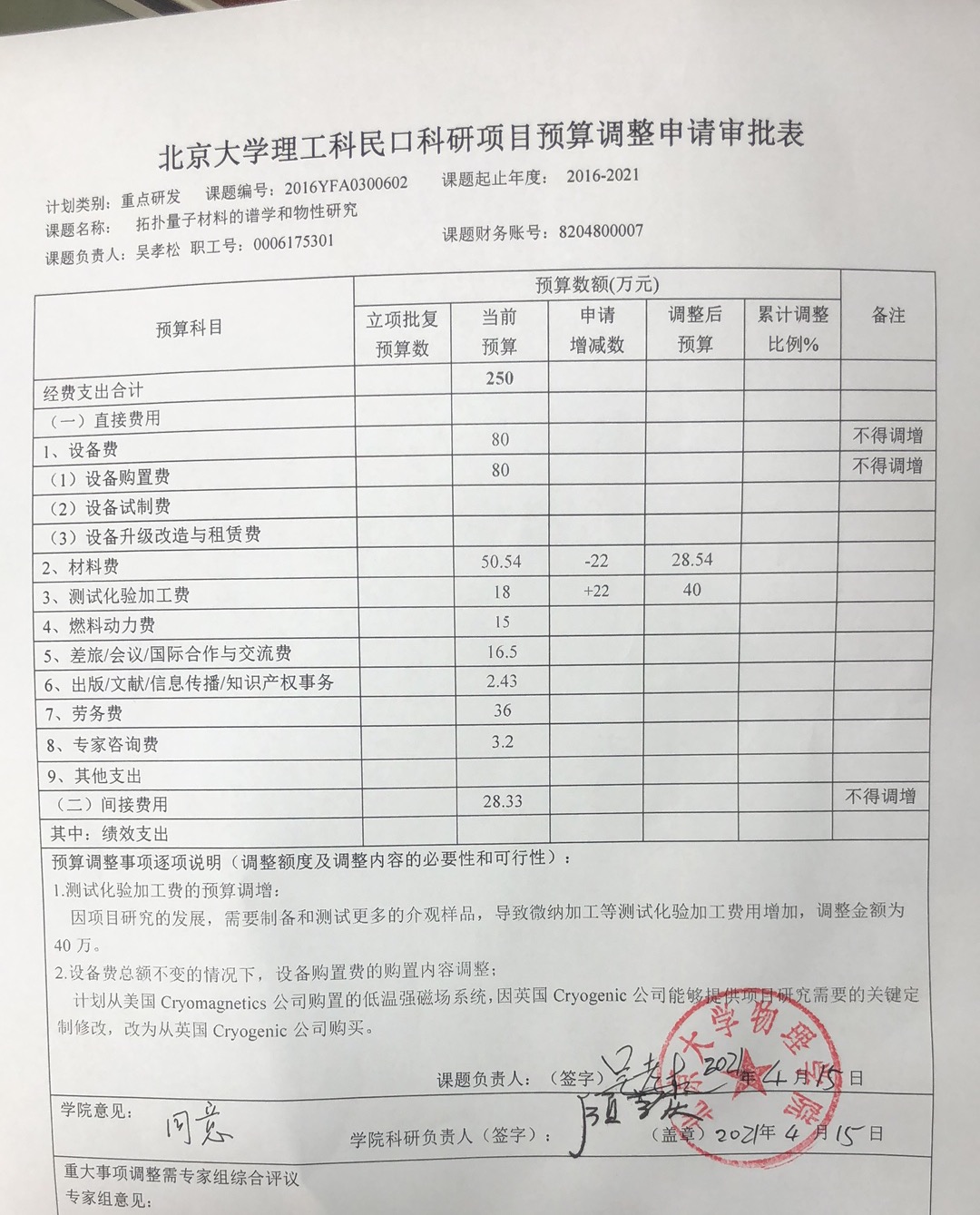 根据《关于实施北京大学理工科民口科研项目预算调剂规定的通知》,现将北京大学理工科民口科研项目“拓扑量子材料的谱学和物性研究”预算调整申请审批表相关内容予以公示。