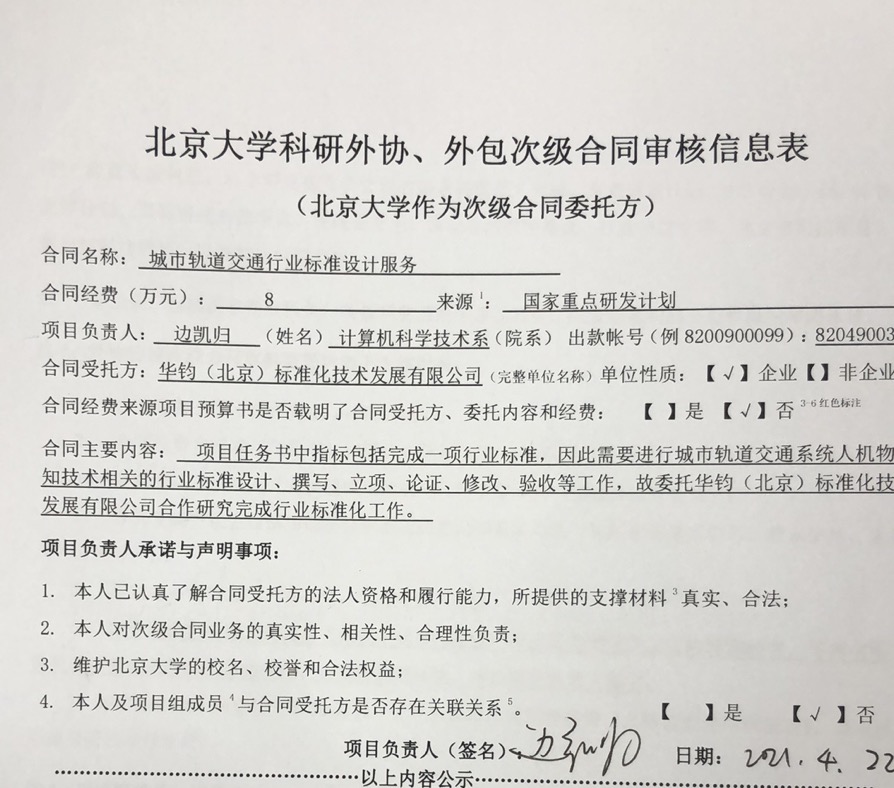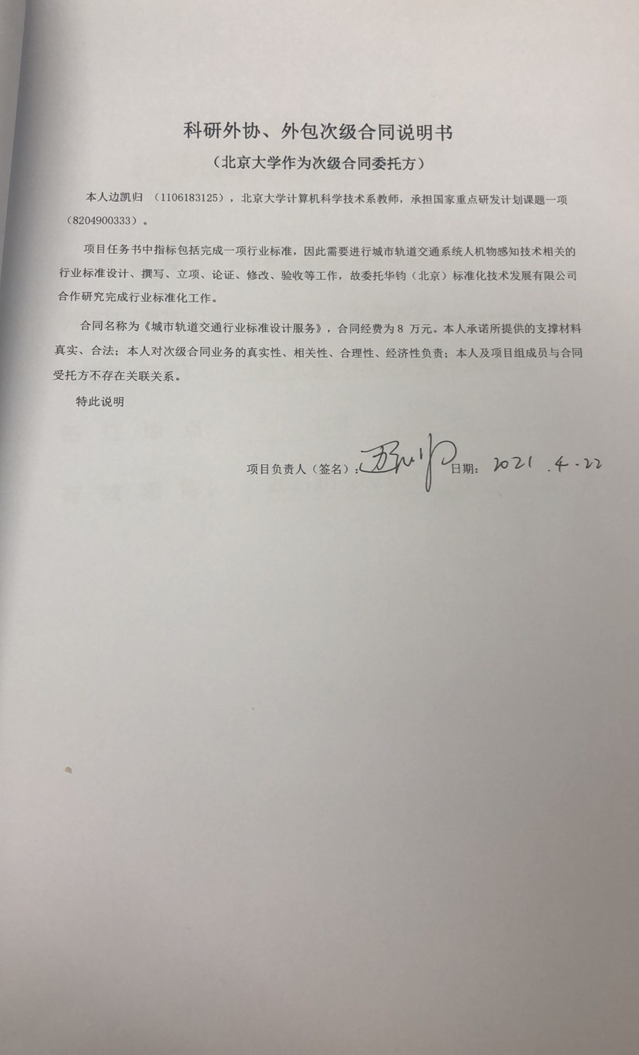 根据《关于北京大学理工科科研次级合同管理的通知》,现将北京大学理工科科研次级合同“城市轨道交通行业标准设计服务”相关内容予以公示。