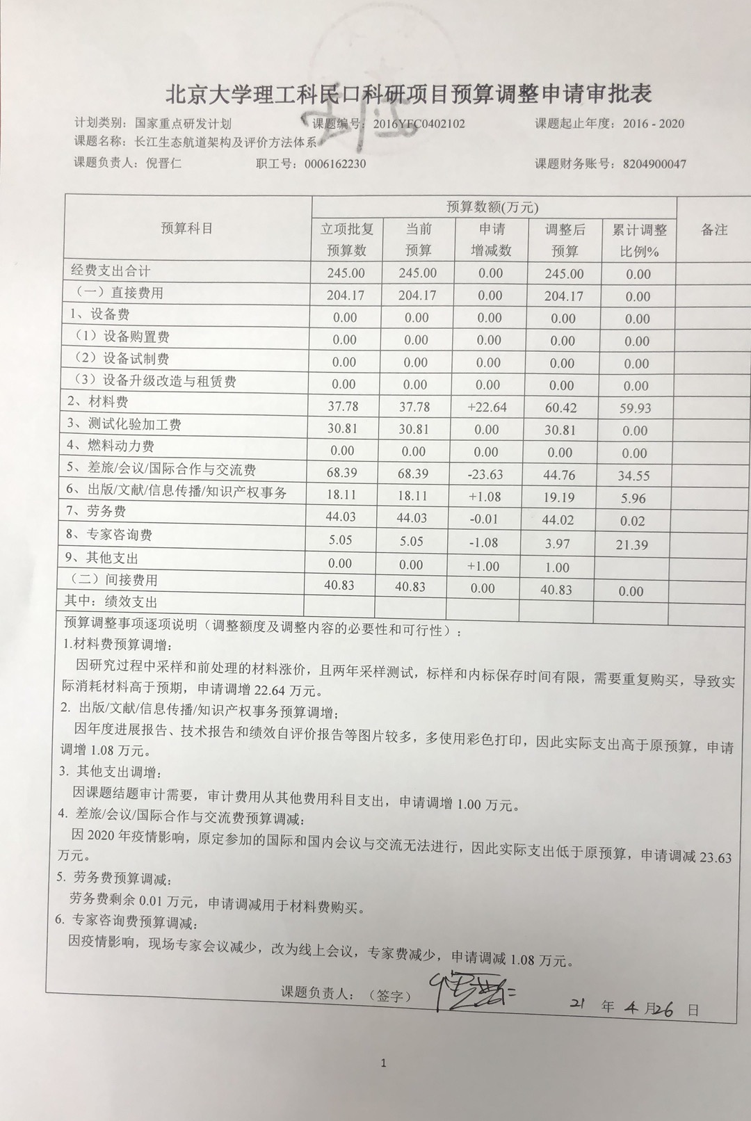 根据《关于实施北京大学理工科民口科研项目预算调剂规定的通知》,现将北京大学理工科民口科研项目“长江生态航道架构及评价方法体系”预算调整申请审批表相关内容予以公示。