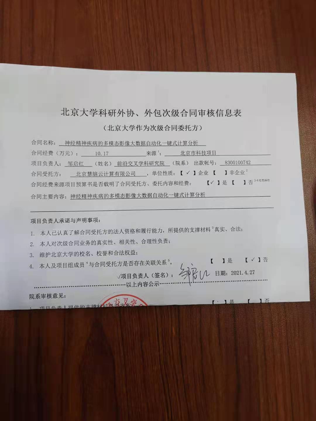 根据《关于北京大学理工科科研次级合同管理的通知》,现将北京大学理工科科研次级合同神经精神疾病的多模态影像大数据自动化一键式计算分析”的相关内容予以公示。公示时间:2021年04月28日-2021年05月03日(3个工作日)。合同相关纸质材料可经预约后到勺园5乙330办公室进行查阅。