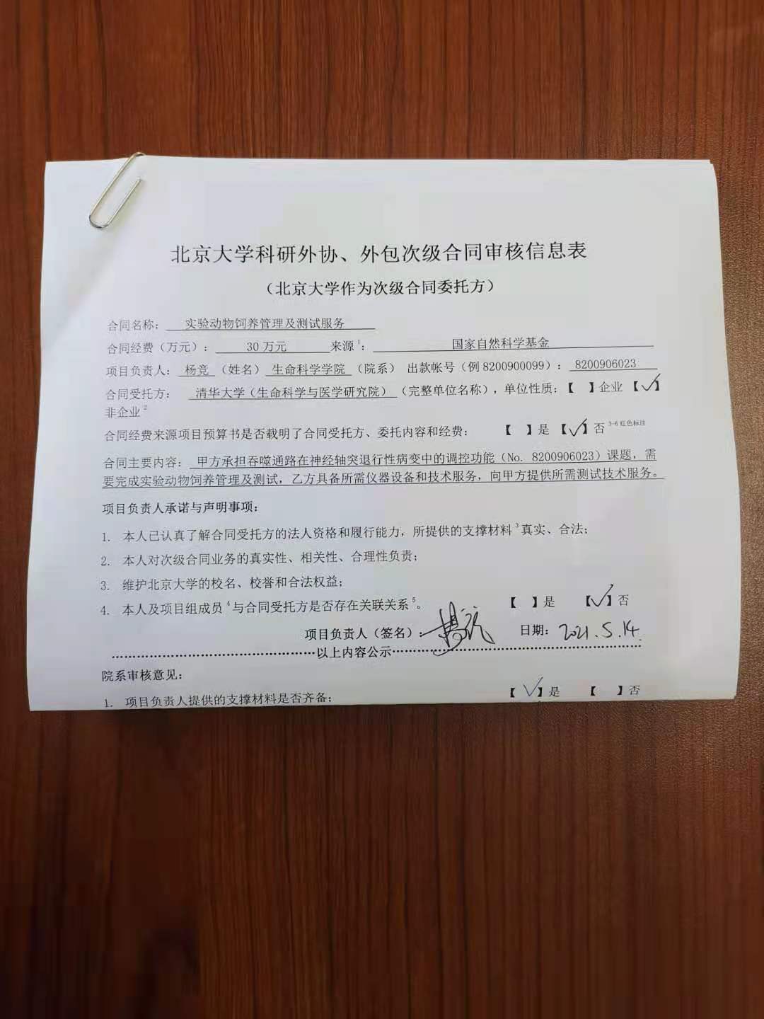 根据《关于北京大学理工科科研次级合同管理的通知》,现将北京大学理工科科研次级合同实验动物饲养管理及测试服务”的相关内容予以公示。公示时间:2021年05月17日-2021年05月19日(3个工作日)。合同相关纸质材料可经预约后到勺园5乙330办公室进行查阅。