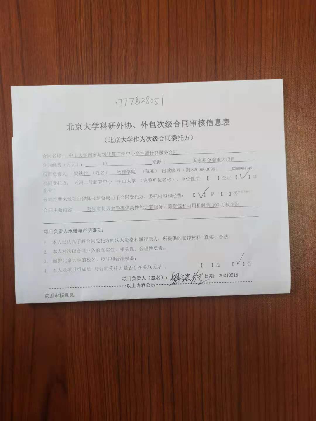 根据《关于北京大学理工科科研次级合同管理的通知》,现将北京大学理工科科研次级合同中山大学国家超级计算广州中心高性能计算服务合同”的相关内容予以公示。公示时间:2021年05月19日-2021年05月21日(3个工作日)。合同相关纸质材料可经预约后到勺园5乙330办公室进行查阅。