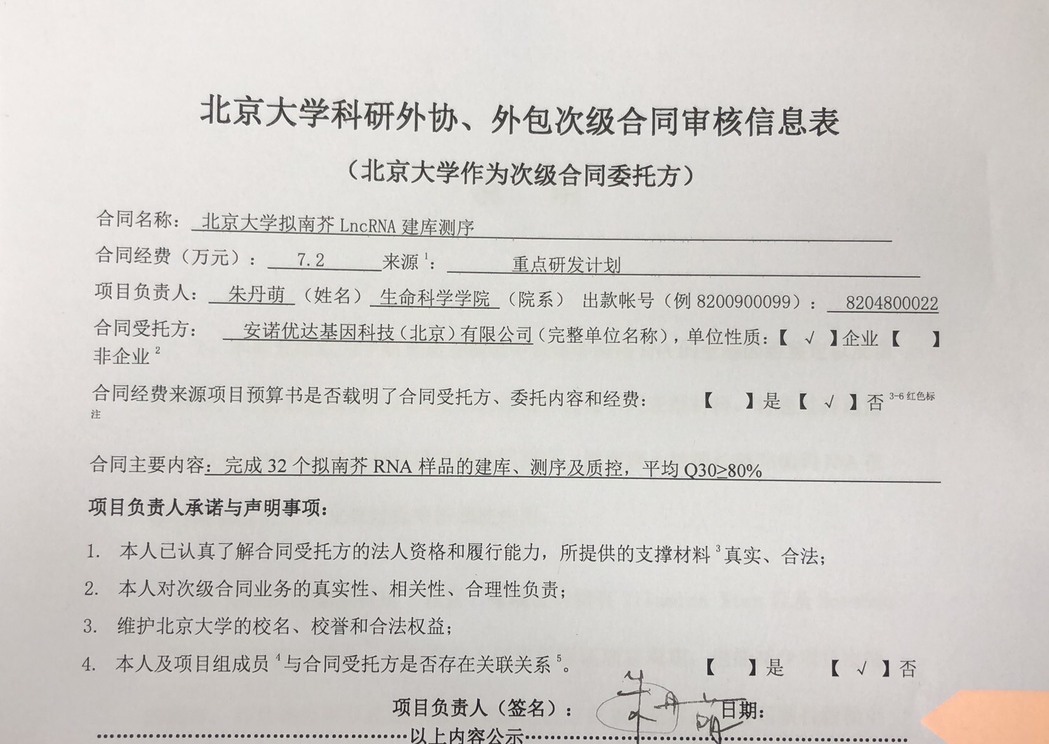 根据《关于北京大学理工科科研次级合同管理的通知》,现将北京大学理工科科研次级合同“北京大学拟南芥LncRNA建库测序”相关内容予以公示。