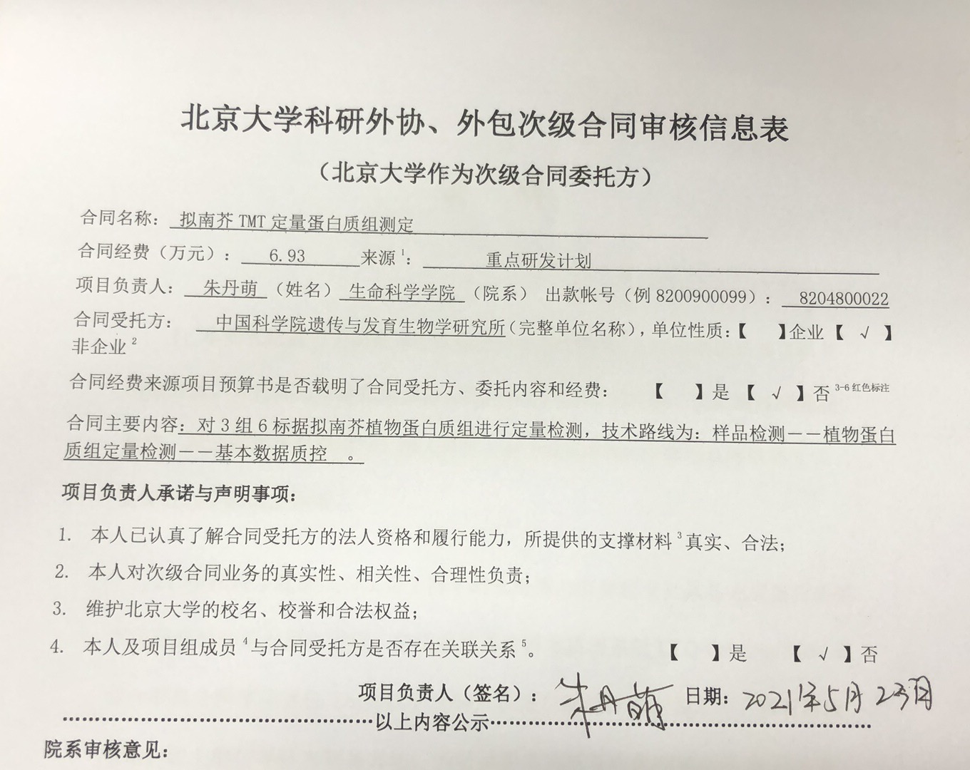 根据《关于北京大学理工科科研次级合同管理的通知》,现将北京大学理工科科研次级合同“拟南芥TMT定量蛋白质组测定”相关内容予以公示。