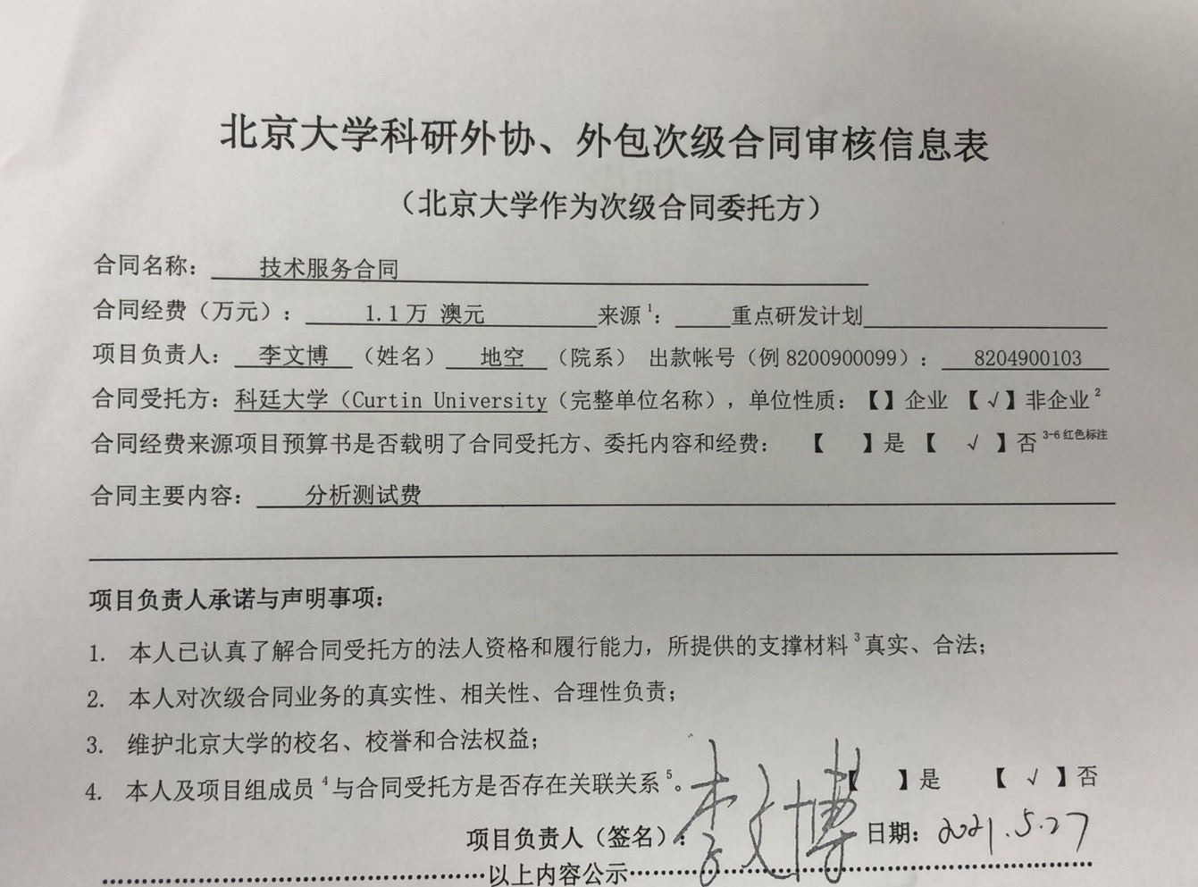 根据《关于北京大学理工科科研次级合同管理的通知》,现将北京大学理工科科研次级合同“技术服务合同”相关内容予以公示。
