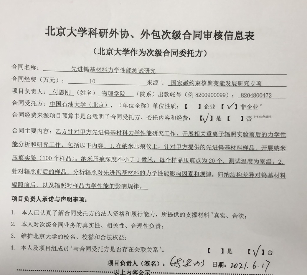 根据《关于北京大学理工科科研次级合同管理的通知》,现将北京大学理工科科研次级合同“先进钨基材料力学性能测试研究”相关内容予以公示。