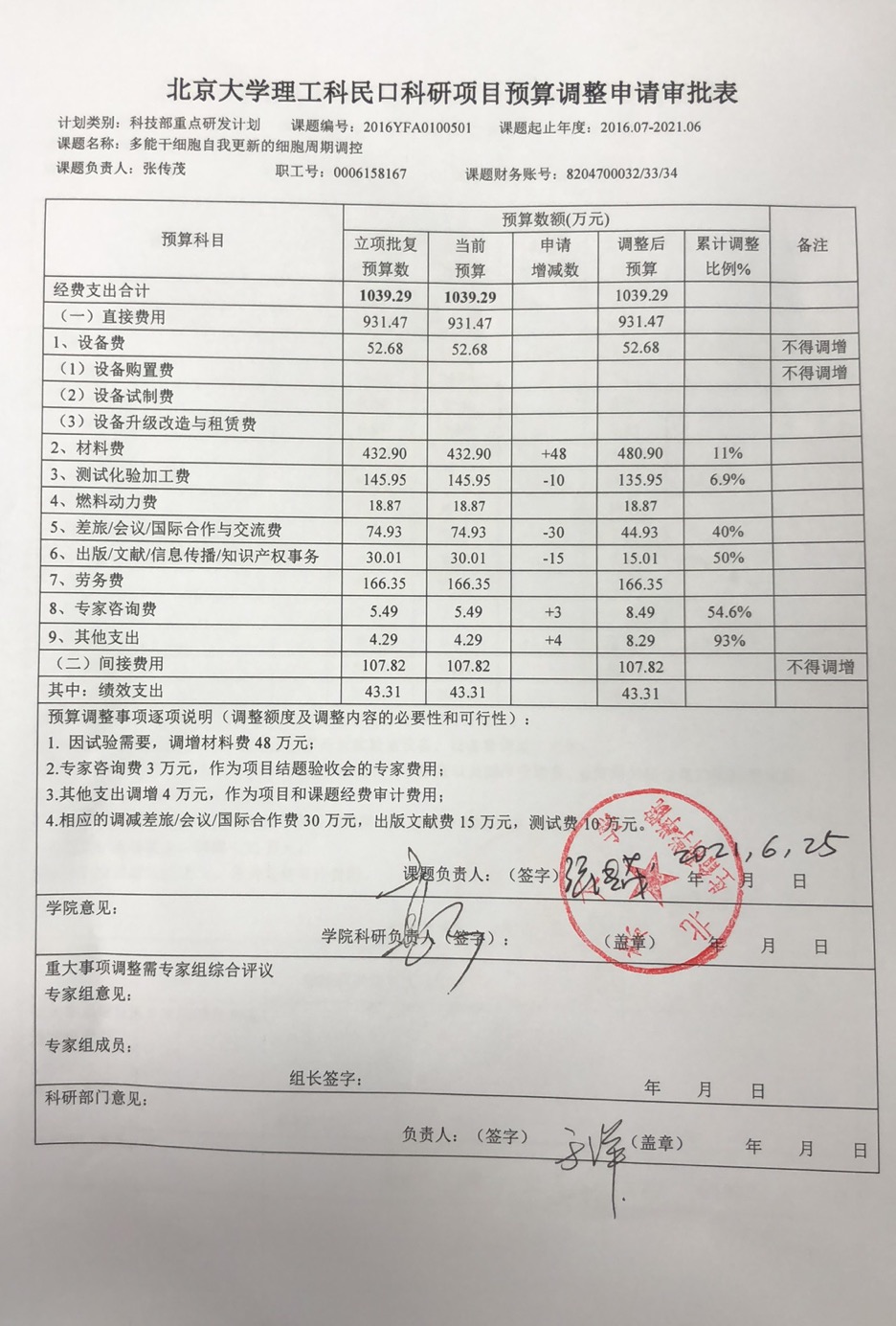 根据《关于实施北京大学理工科民口科研项目预算调剂规定的通知》,现将北京大学理工科民口科研项目“多能干细胞自我更新的细胞周期调控”预算调整申请审批表相关内容予以公示。