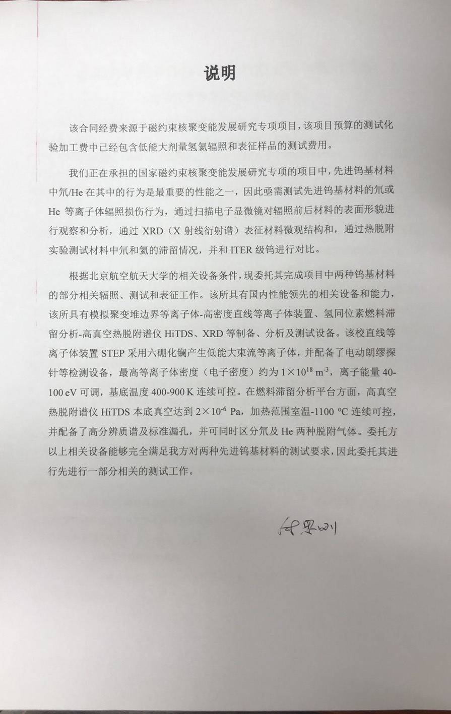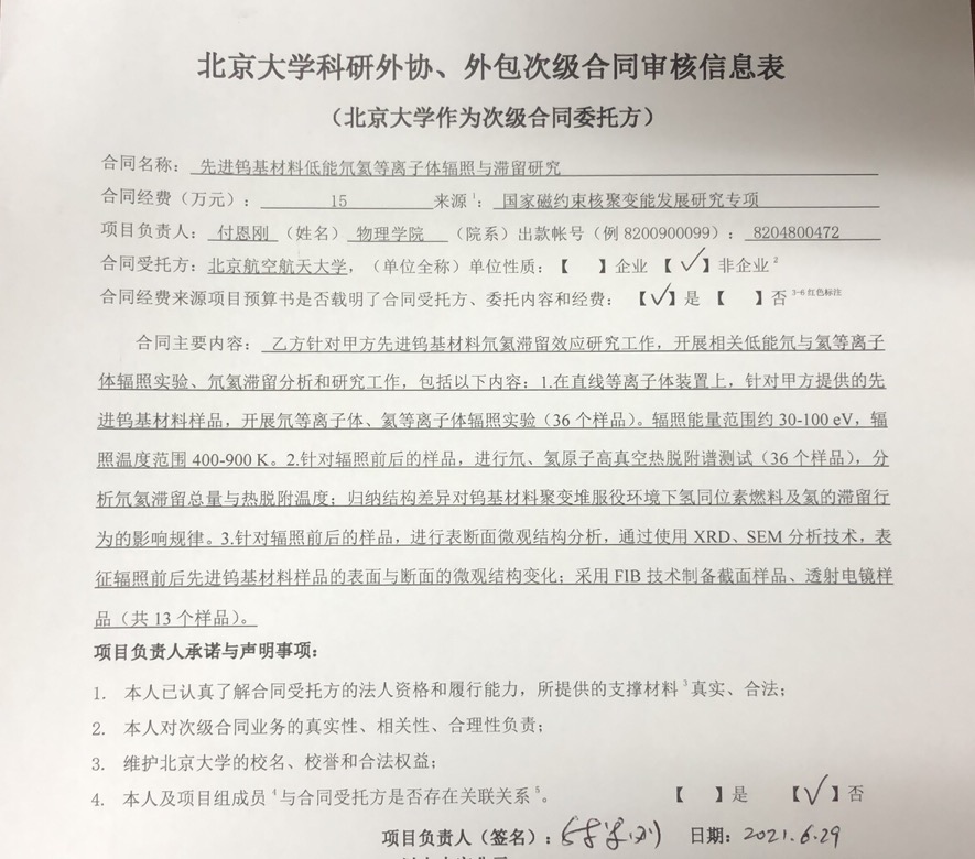 根据《关于北京大学理工科科研次级合同管理的通知》,现将北京大学理工科科研次级合同“先进钨基材料低能氘氦等离子体辐照与滞留研究”相关内容予以公示。