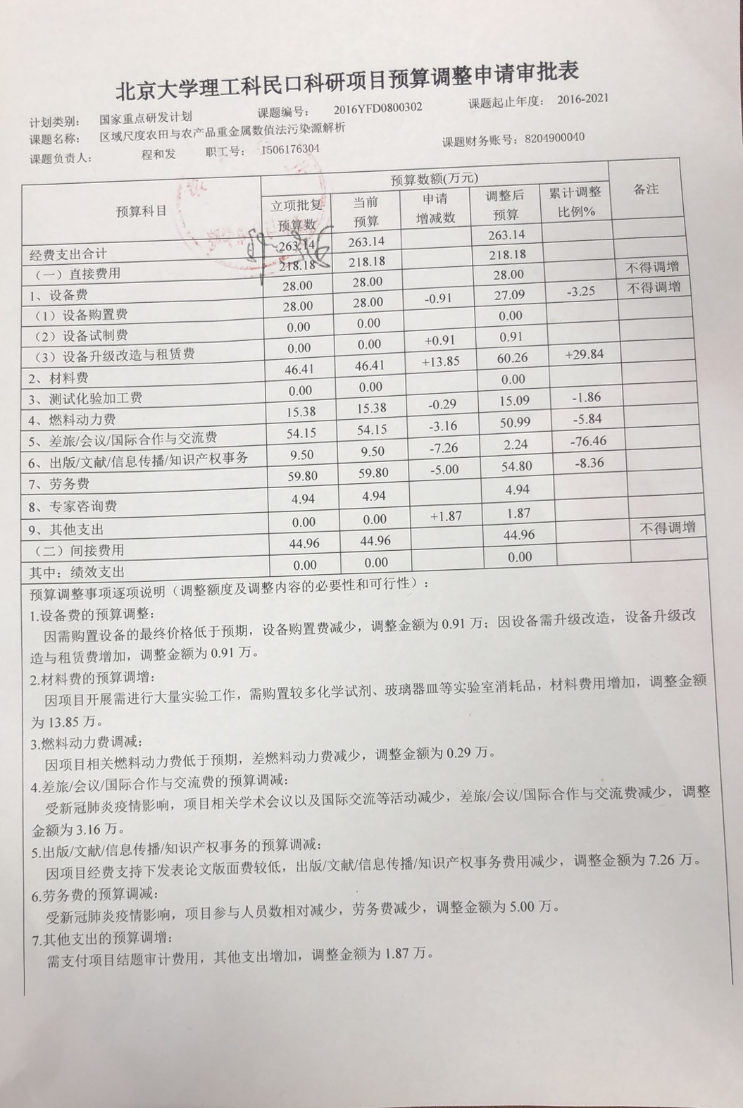 根据《关于实施北京大学理工科民口科研项目预算调剂规定的通知》,现将北京大学理工科民口科研项目“区域尺度农田与农产品重金属数值法污染源解析”预算调整申请审批表相关内容予以公示。
