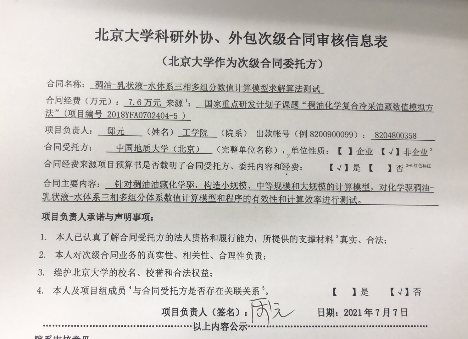 根据《关于北京大学理工科科研次级合同管理的通知》,现将北京大学理工科科研次级合同“稠油-乳状液-水体系三相多组分数值计算模拟求解算法测试”相关内容予以公示。